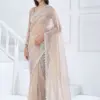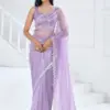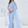 - The blouse is adorned with heavy Swarovski work, complementing the design of the saree.