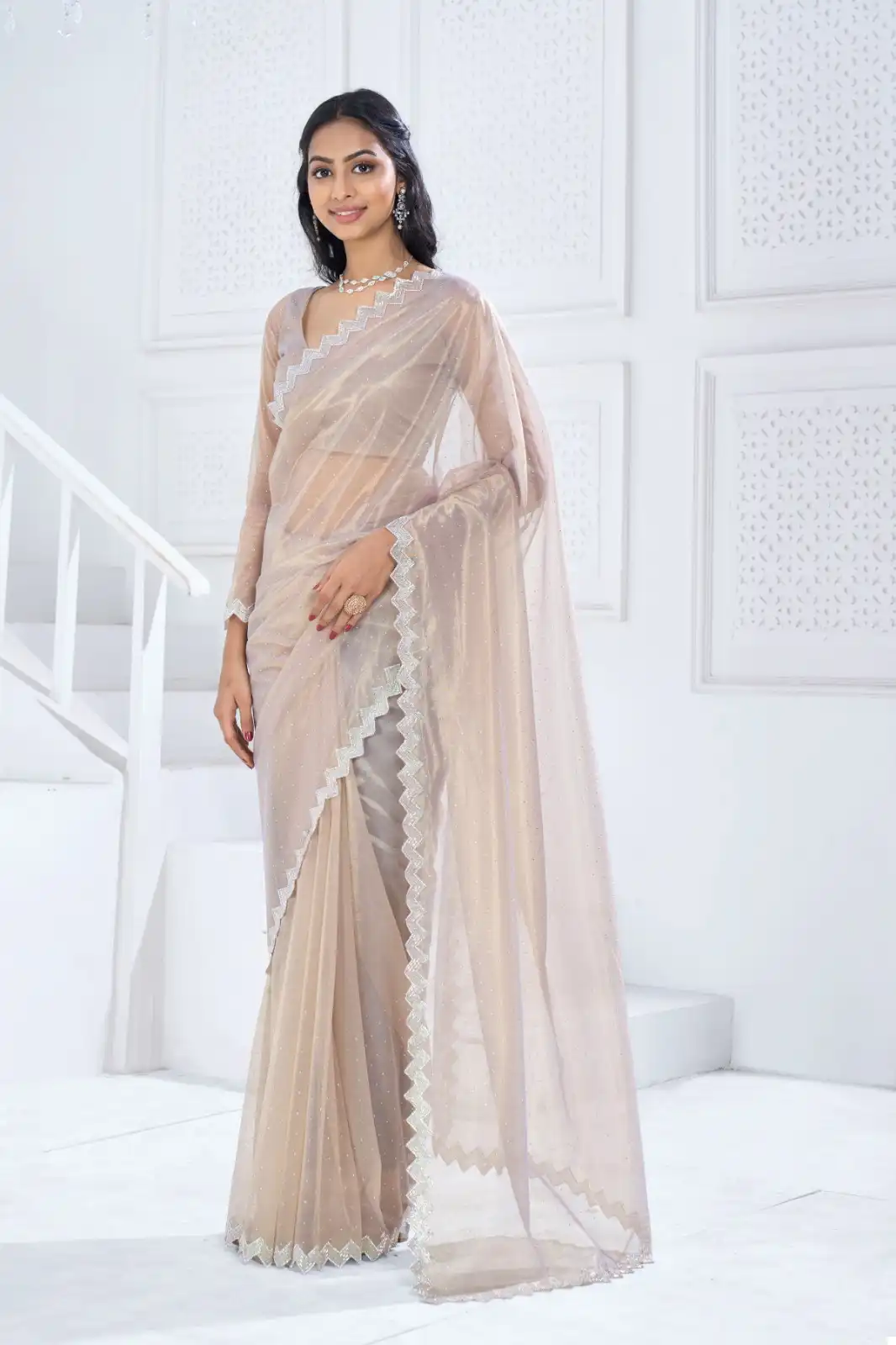 - Saree: Made of Twirll Soft Organza with Heavy Swarovski Work. Features Blouses with Heavy Handwork Border and Swarovski Embellishments All Over the Saree.
