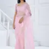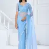 - The saree is crafted from Twirll Soft Organza fabric and features heavy Swarovski work, adding sparkle and elegance to the design. The saree also includes blouses with heavy handwork border and Swarovski embellishments all over.