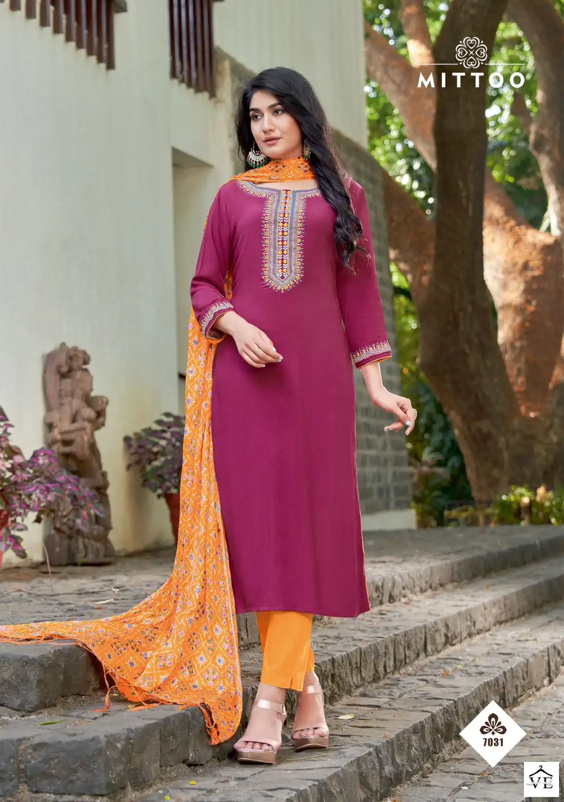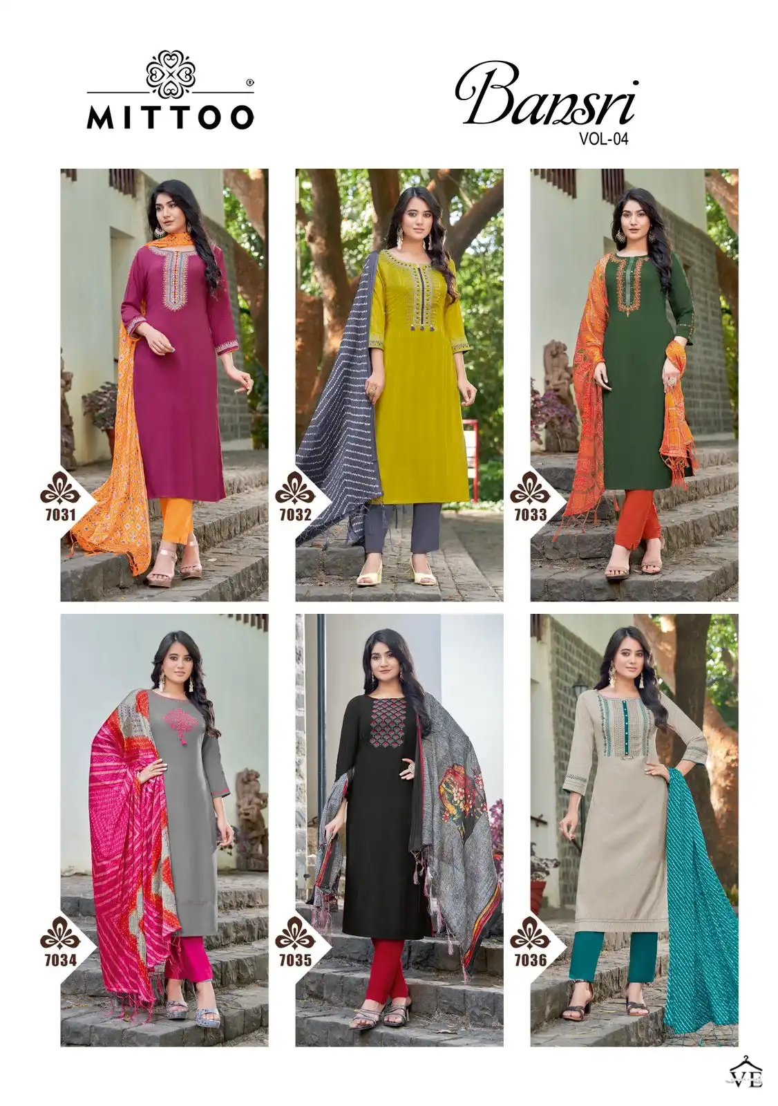Mittoo Bansari Vol 4 Rayon Weaving Wholesale Designer Readymade Salwar Suit Catalog 6 Pcs. We deal in Kurtis, Sarees, Dresses Materials, Leggings, and Designer Salwar Kameez.