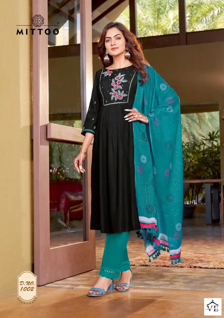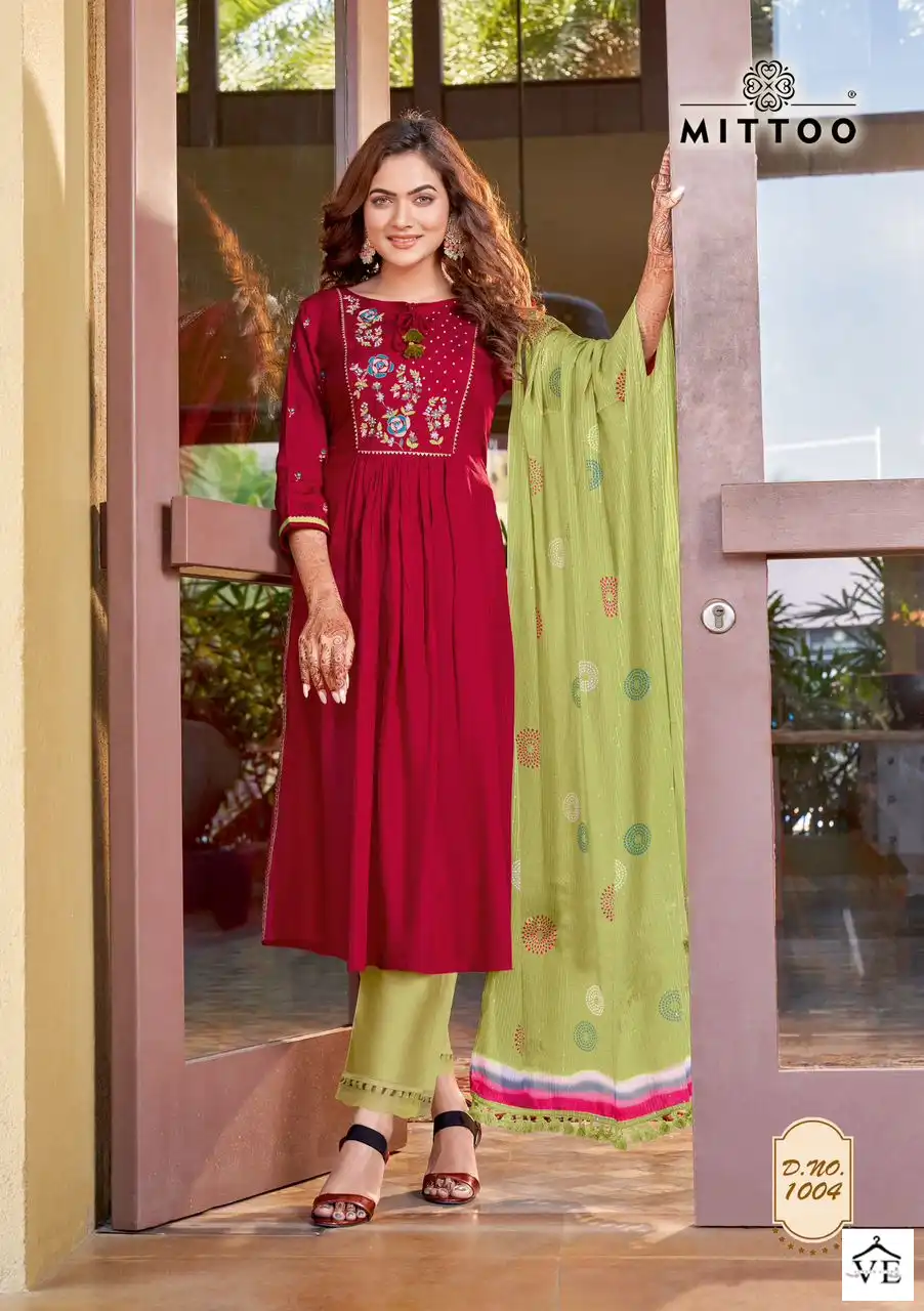 Mittoo Kiara Rayon Weaving Wholesale Readymade Salwar Suit Catalog 6 Pcs. We deal in Kurtis, Sarees, Dresses Materials, Leggings, and Designer Salwar Kameez.