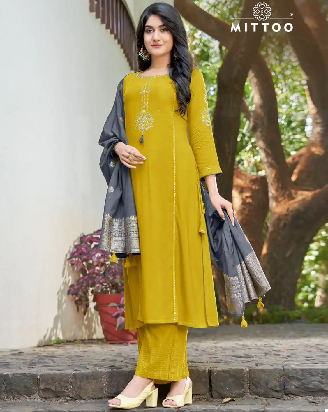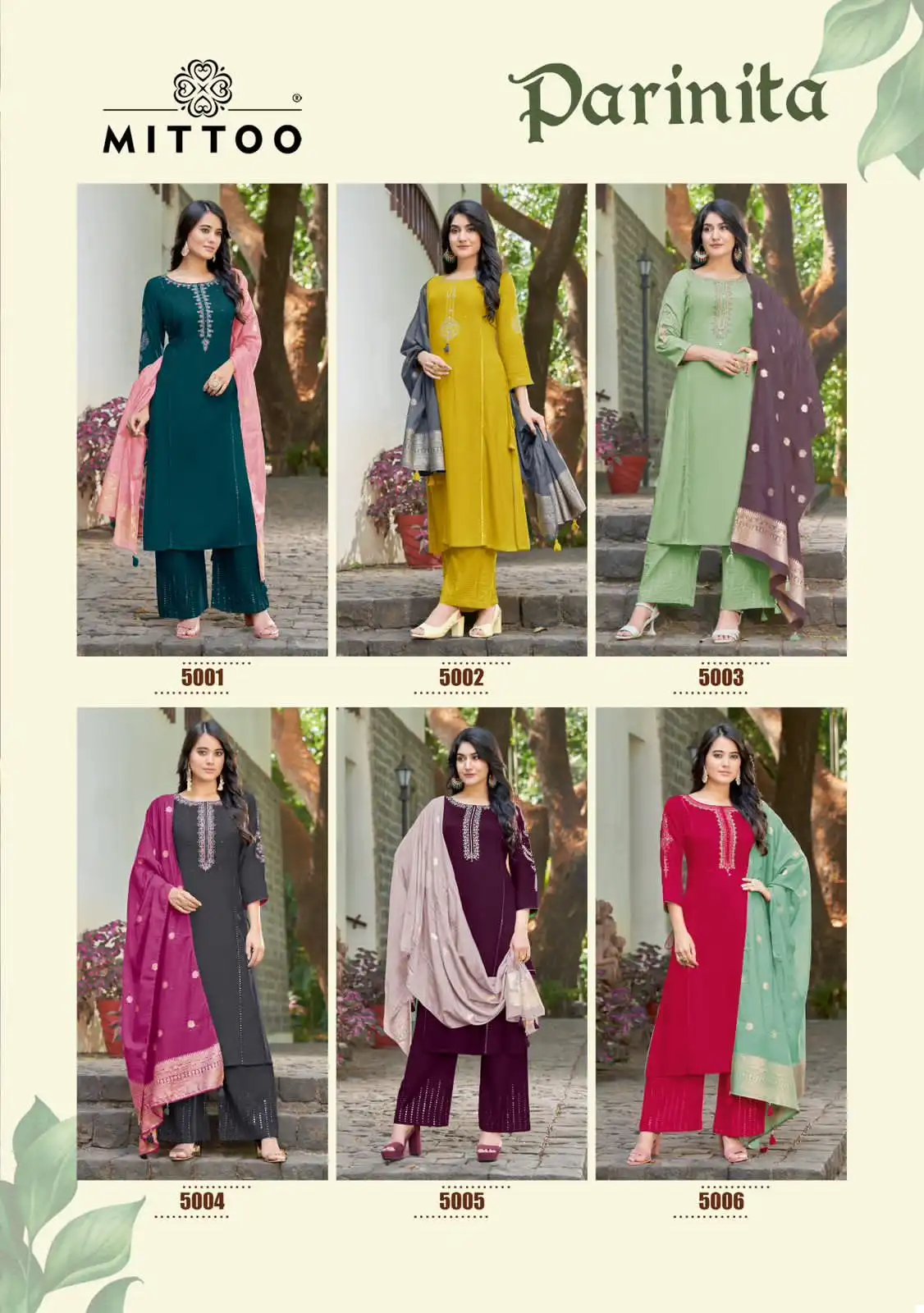 Mittoo Parnita Heavy Rayon Wholesale Readymade Salwar Suit Catalog 6 Pcs. We deal in Kurtis, Sarees, Dresses Materials, Leggings, and Designer Salwar Kameez.