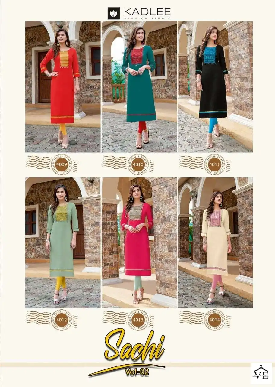 Mittoo Sachi Vol 2 Heavy Rayon Wholesale Kurti Catalog of 6 Pcs. We deal in Kurtis, Sarees, Dresses Materials, Leggings, and Designer Salwar Kameez.