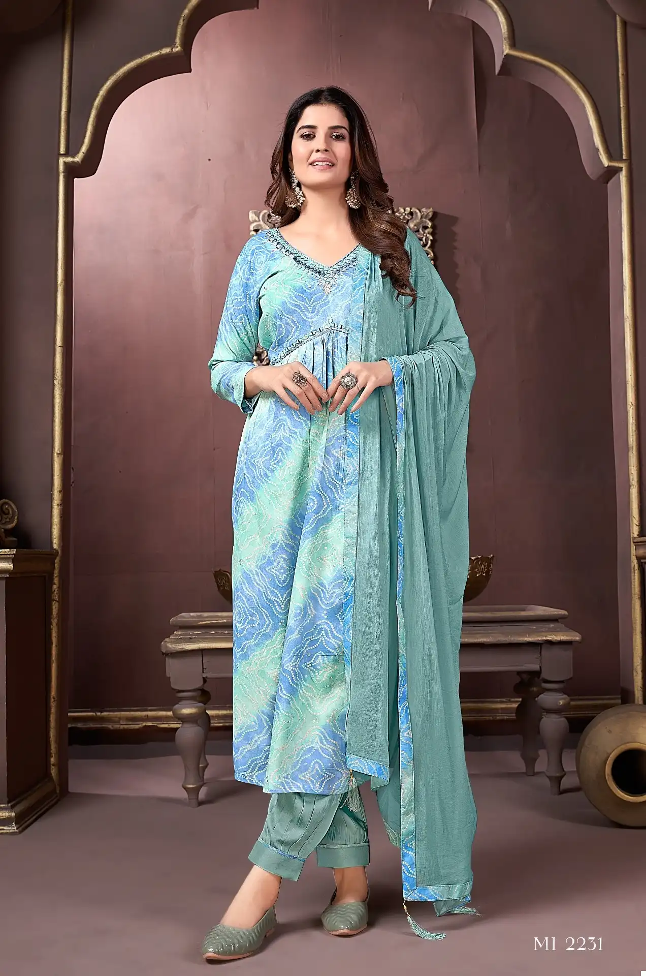 - Top: Premium Rayon Export Quality Handwork Full stitched – This describes the top part of the outfit, which is made of premium rayon fabric of export quality and features handwork. It is fully stitched.