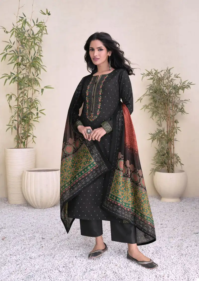 - Top: Pure Jam Satin Digital Foil In Sleeves Daman & Pant With Heavy Neck Embroidery – This describes the top part of the outfit, which is made of pure jam satin with digital foil print in sleeves and daman, along with heavy neck embroidery. The pant also seems to have heavy neck embroidery.