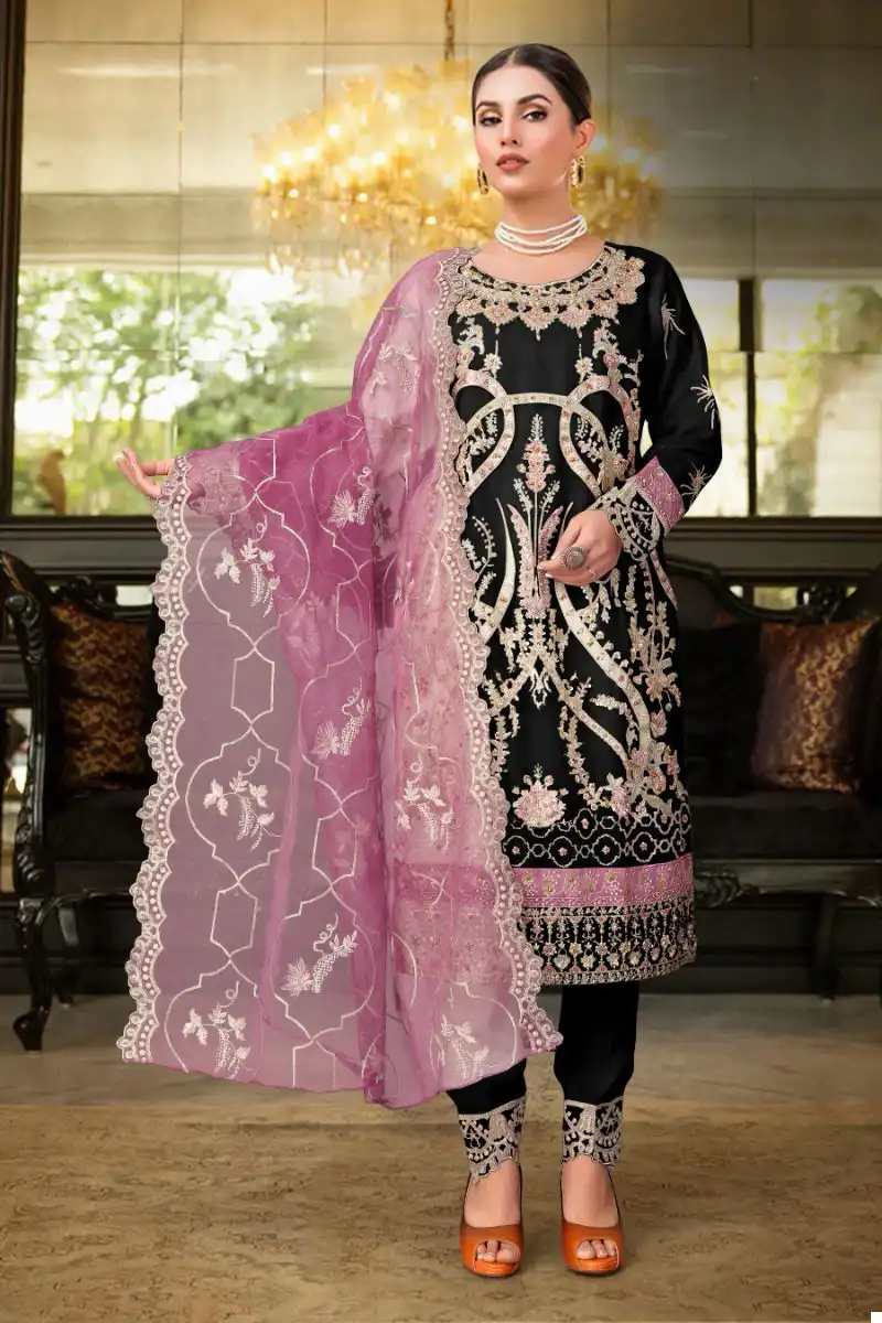 Bottom: The ensemble is paired with a bottom made from Santoon, a smooth and shiny fabric valued for its comfort and elegance. This pairing of Santoon with organza brings a balance of luxury and practicality to the outfit.