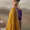 - Exude timeless elegance with this mustard tissue silk saree, beautifully crafted for a regal festive look. The saree features a soft, lustrous tissue silk base enhanced with a heavily embroidered scalloped border and delicate butti work, adding richness without overpowering the look.