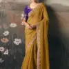 - Paired with a royal purple embroidered blouse, this saree creates a striking contrast that elevates its traditional charm. The graceful drape and refined embroidery make it an ideal choice for weddings, festive celebrations, receptions, and cultural occasions.
