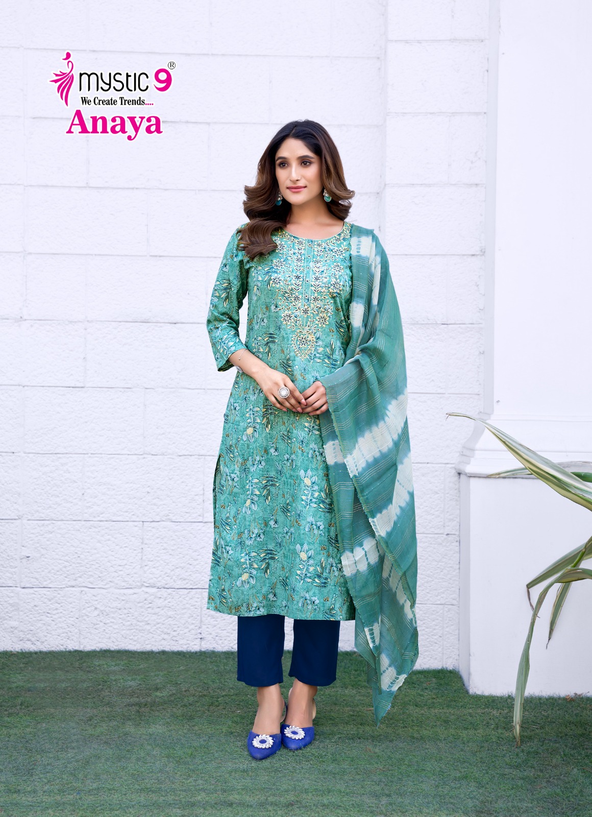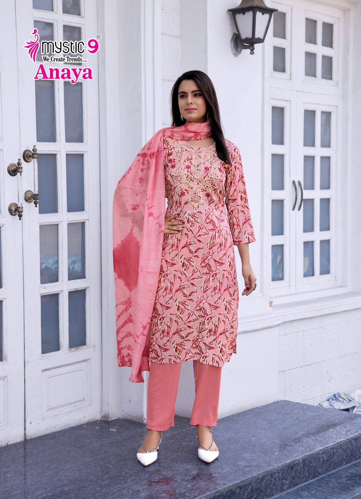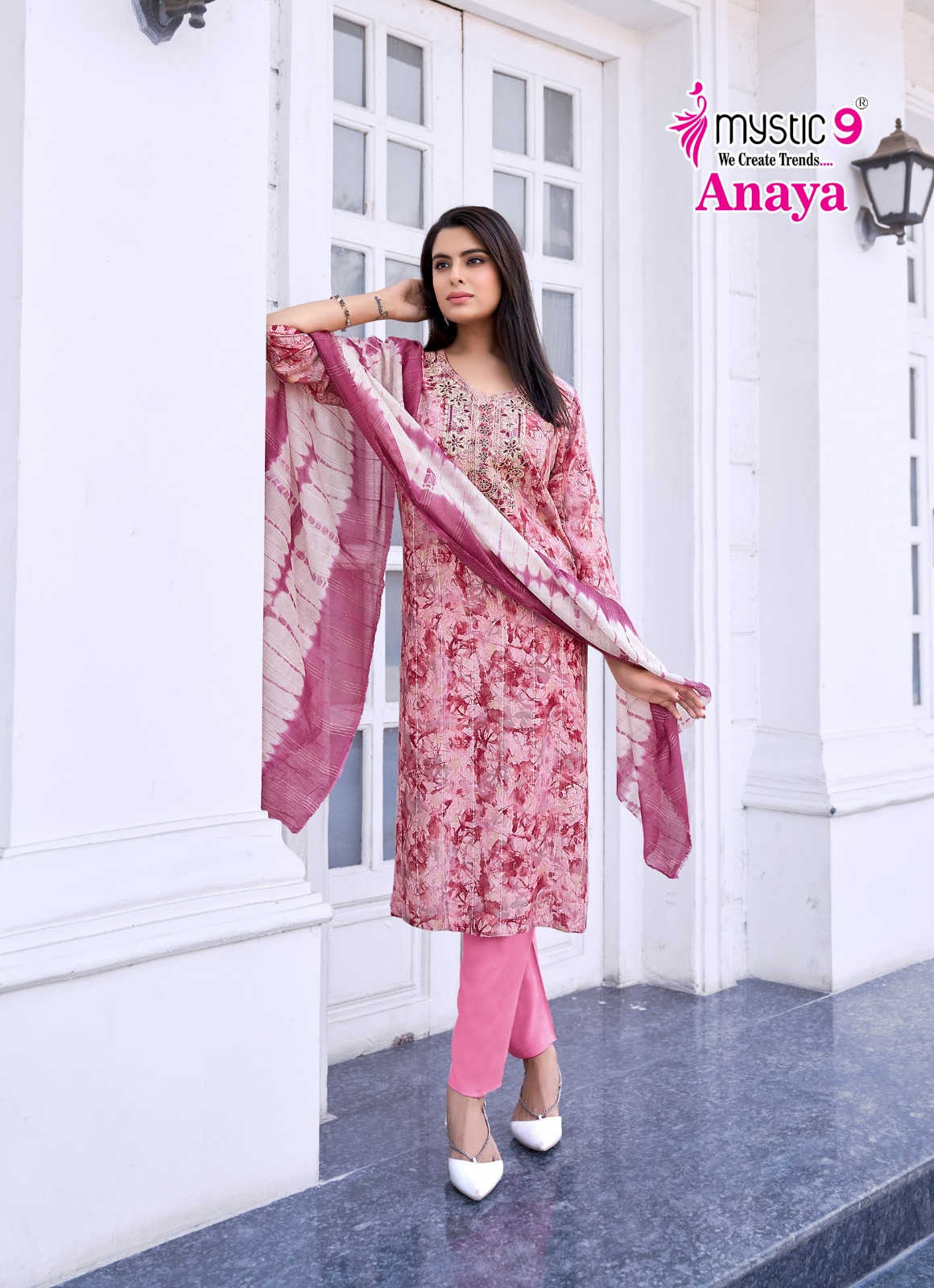 - Top: Rayon Dobby with Lurex Foil Print and Embroidery on Neck for a stylish and elegant look.