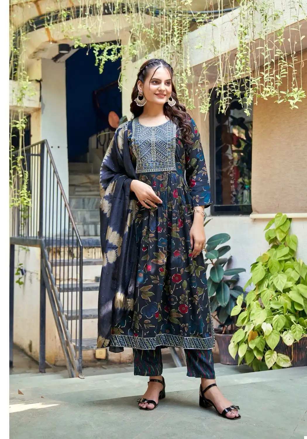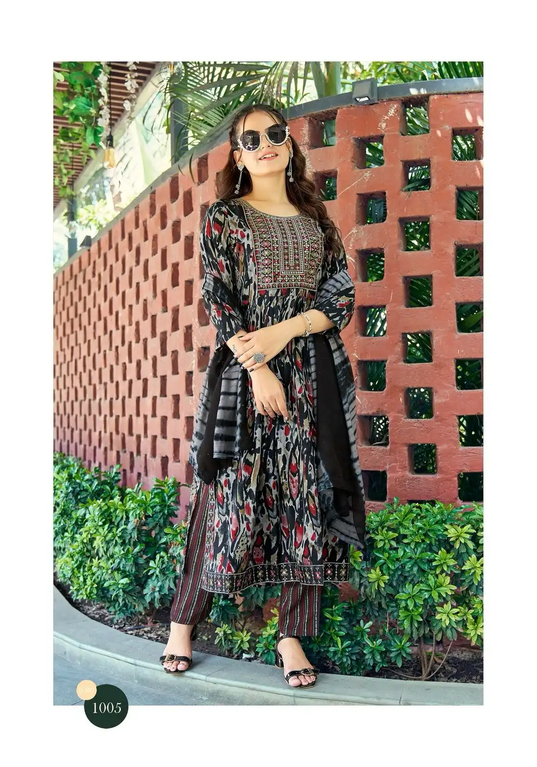 - Top: Heavy Premium Black Rayon Foil Print Fabric Nyra Stitched with Embroidery On Neck, Sleeves 46 Inch Height