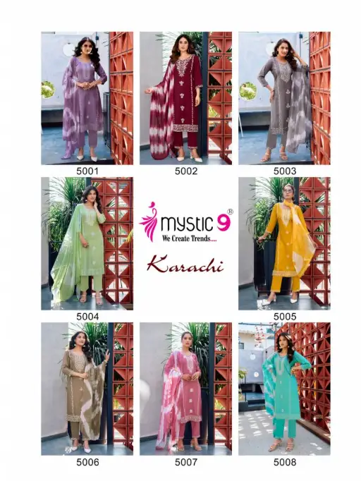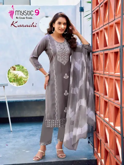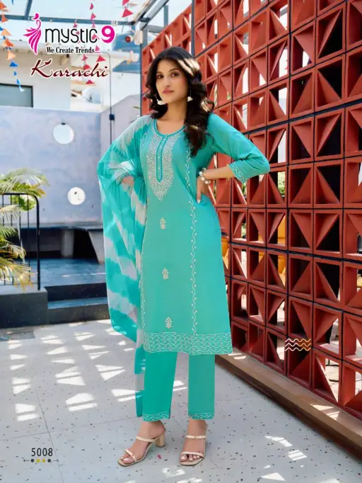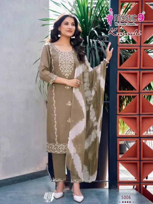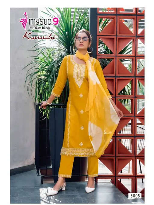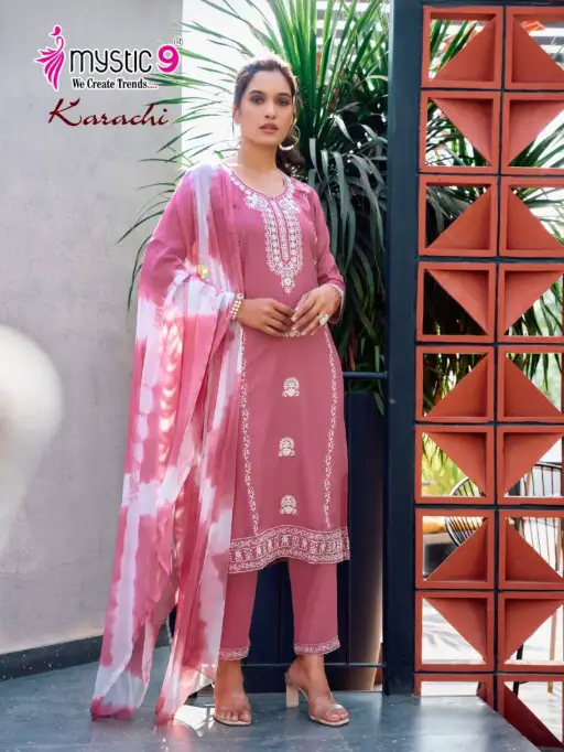 Mystic 9 Karachi Vol 5 Rayon Kurti Bottom Dupatta Wholesale Catalog.