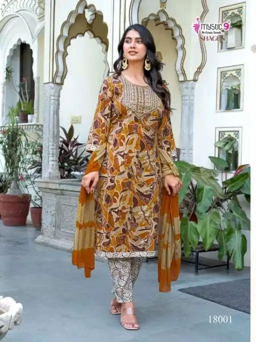 Buy Mystic 9 Shagun Vol 18 straight cut rayon suits with capsule foil print and exclusive embroidery at the best wholesale price.