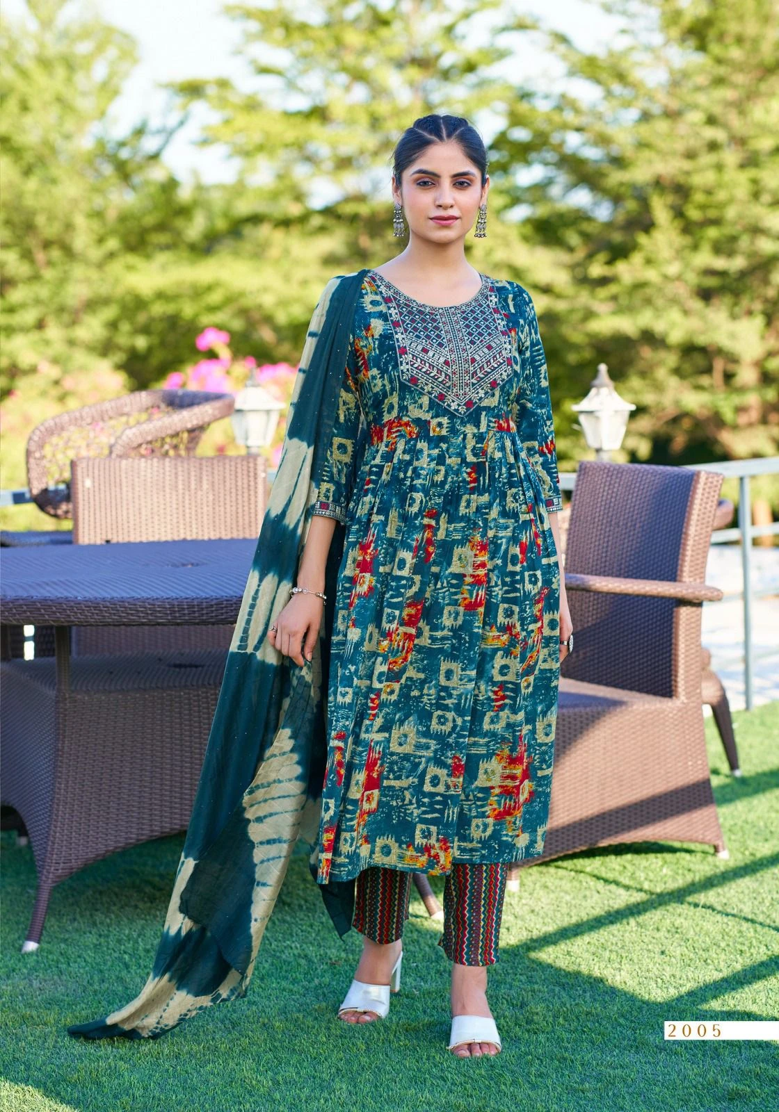 Premium Foil Print Fabric Stitched in Nayra Cut with Embroidery