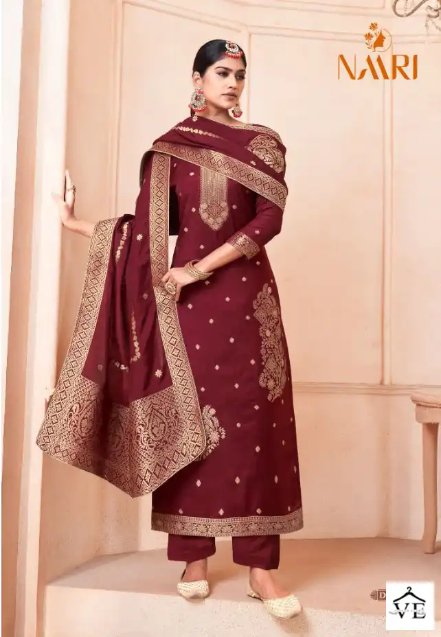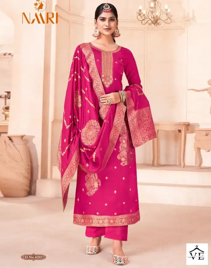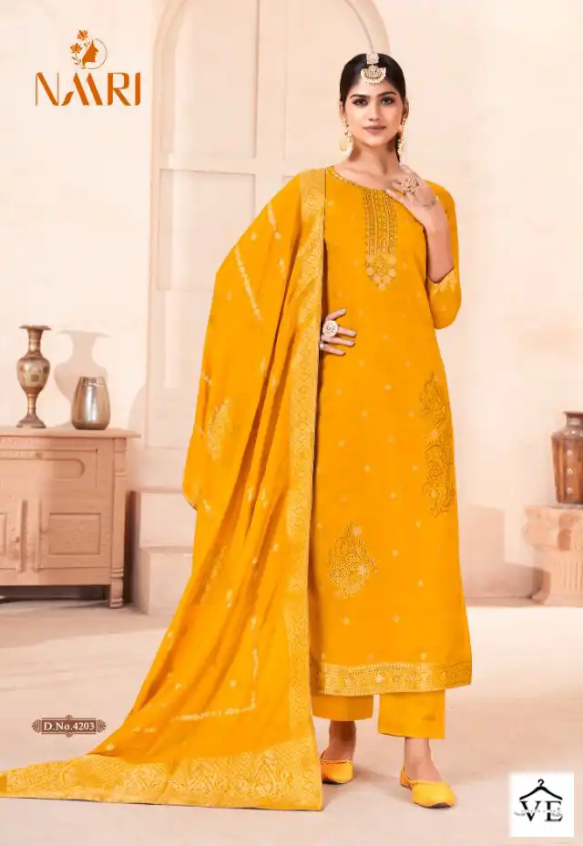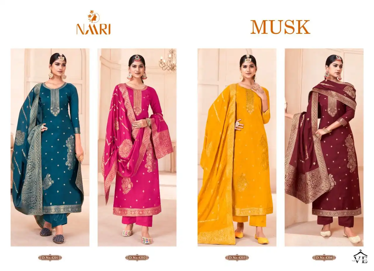 Naari Musk-Muslin Pure Muslin Jacquard Wholesale Salwar Suit Catalog of 4 Pcs. We deal in Kurtis, Sarees, Dresses Materials, Leggings, and Designer Salwar Kameez.