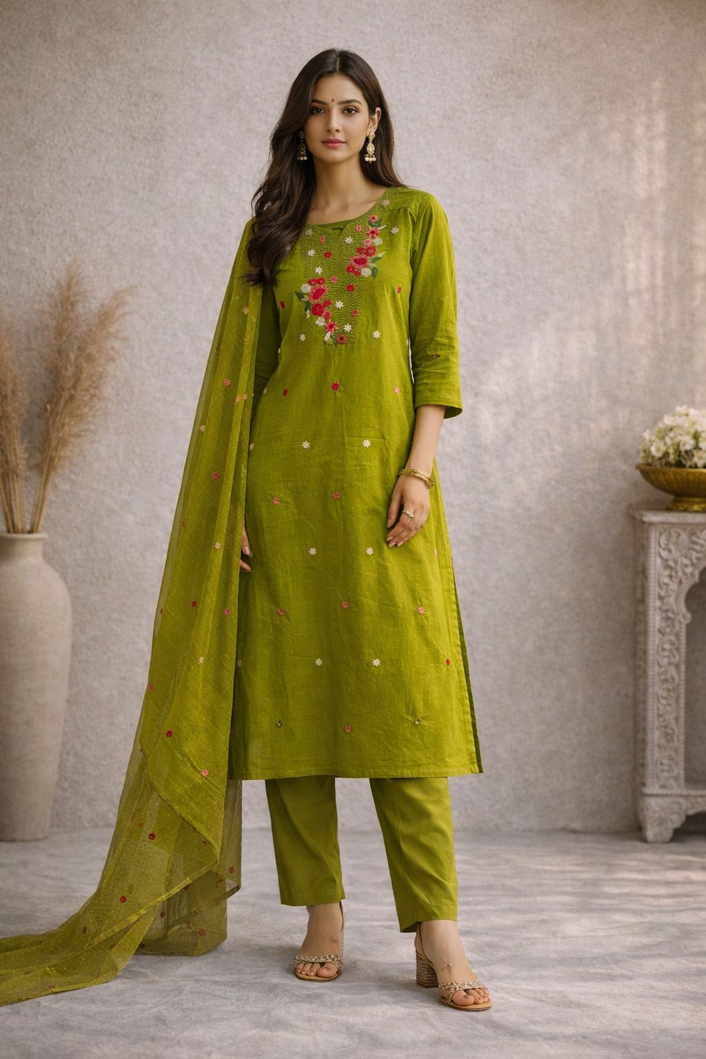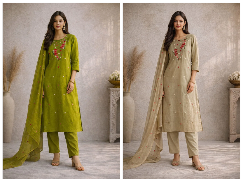 - The subtle yet graceful embroidery work on the top and dupatta enhances its ethnic charm, while the comfortable cotton bottom ensures all-day ease. With a wide size range and attractive wholesale pricing, this catalog is a perfect choice for retailers, wholesalers, and online resellers looking for fast-selling cotton ethnic wear.