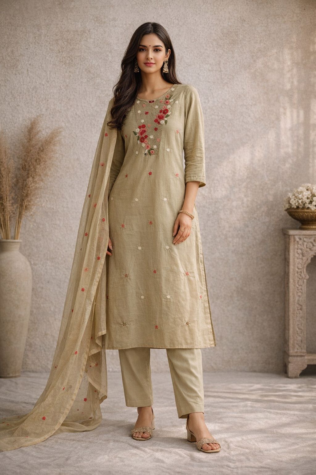 - The Naisha K 710 Cotton Embroidered Suit Set with Dupatta is thoughtfully designed for women who prefer comfort without compromising on traditional elegance. Made from high-quality cotton fabric, this suit set is perfect for Indian festivals, daytime functions, and ethnic office wear.