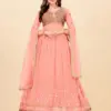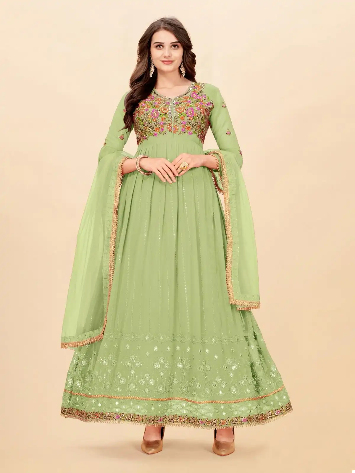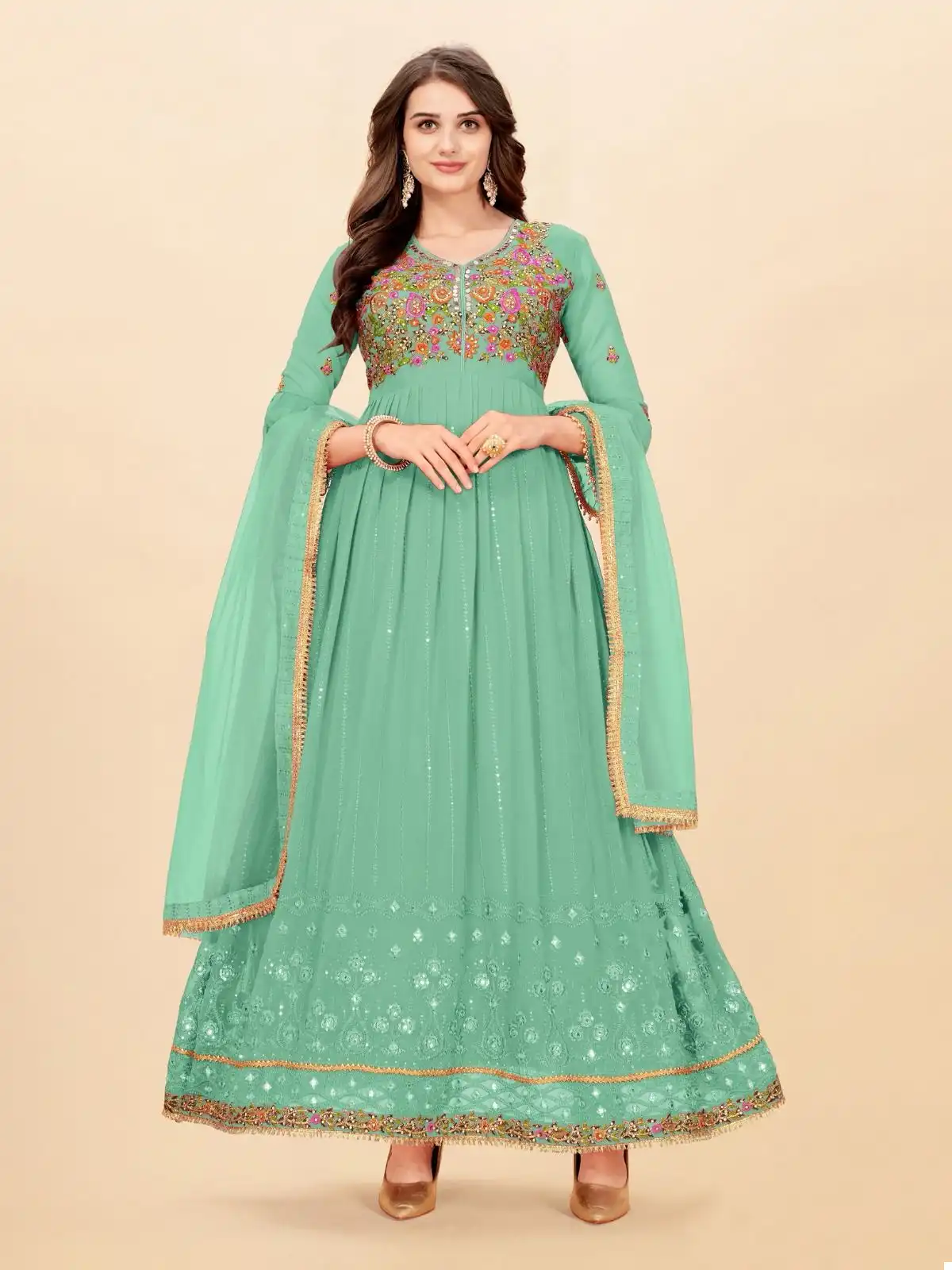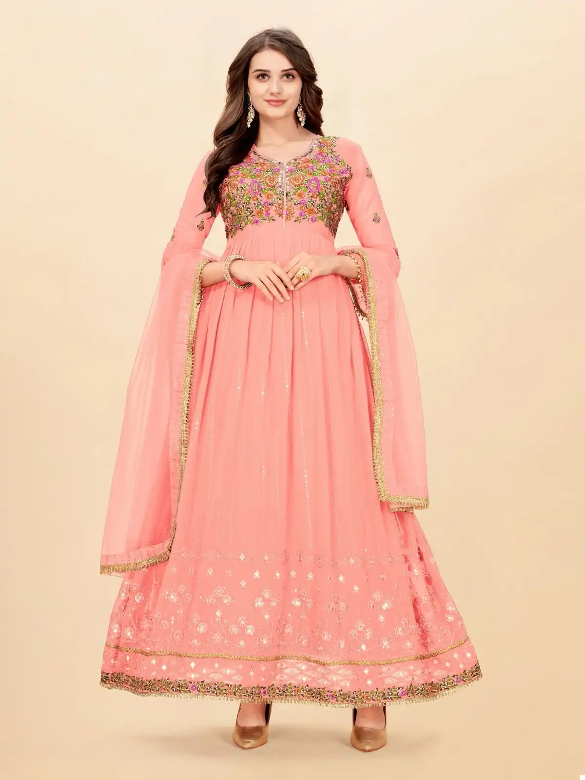 - Top: The top is made from faux georgette, a fabric loved for its lightness and graceful drape, adorned with intricate embroidery that adds depth and sophistication to the design.
