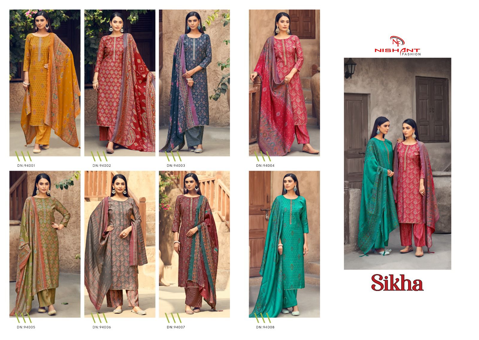 Introducing Sikha by Nishant Fashion, a stylish new catalog featuring a combination of luxurious modal silk fabric with exquisite discharge foil prints and embroidery work. The catalog includes a solid print modal silk bottom and a discharge print dupatta with tassels for that perfect finishing touch. Available in 8 unique designs, each set comes with fancy pouch packing for an extra touch of elegance. Priced at ₹925/- per piece. Elevate your ethnic wear collection with Sikha today!