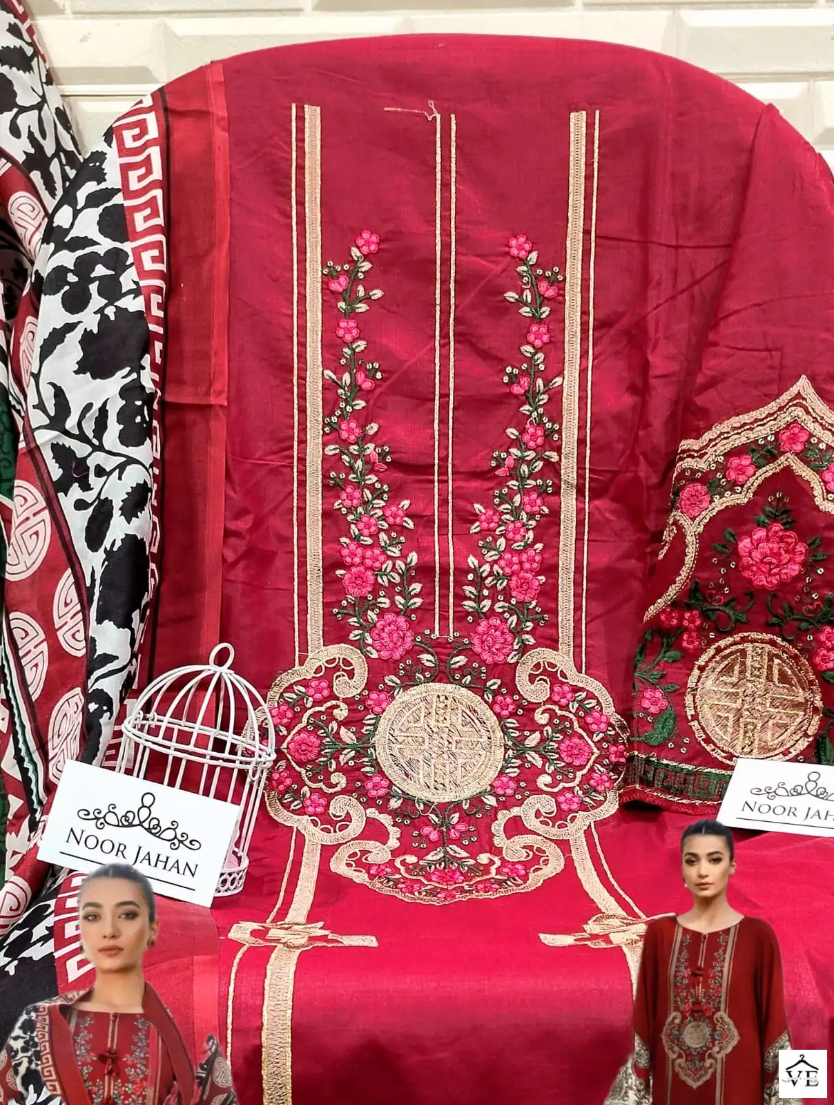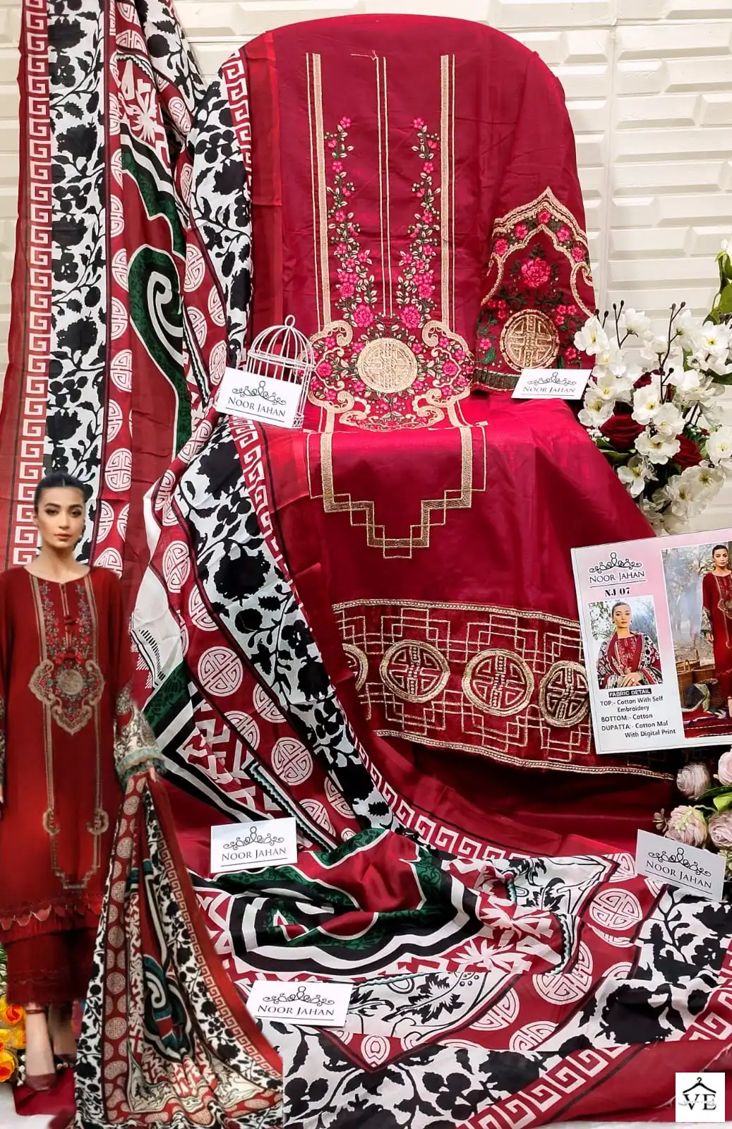 Noor Jahan NJ-7 Cotton Wholesale Pakistani Suit. We deal in Kurtis, Sarees, Dresses Materials, Leggings, and Designer Salwar Kameez.