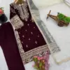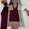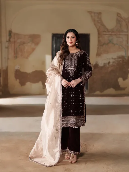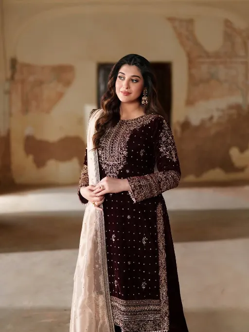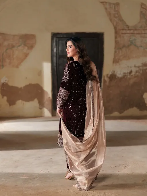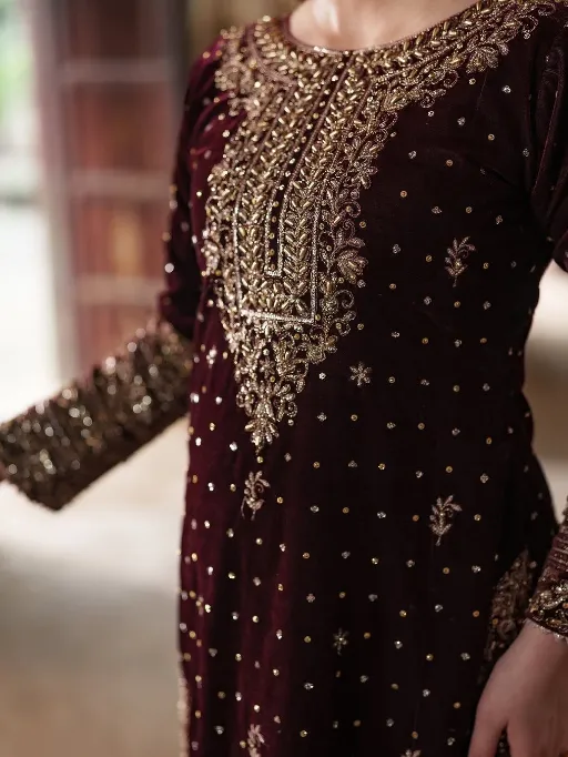 Top Fabric: Pure Heavy Viscose Velvet with Heavy Embroidery Sequence Work & Neck Moti Work (Full Sleeves)