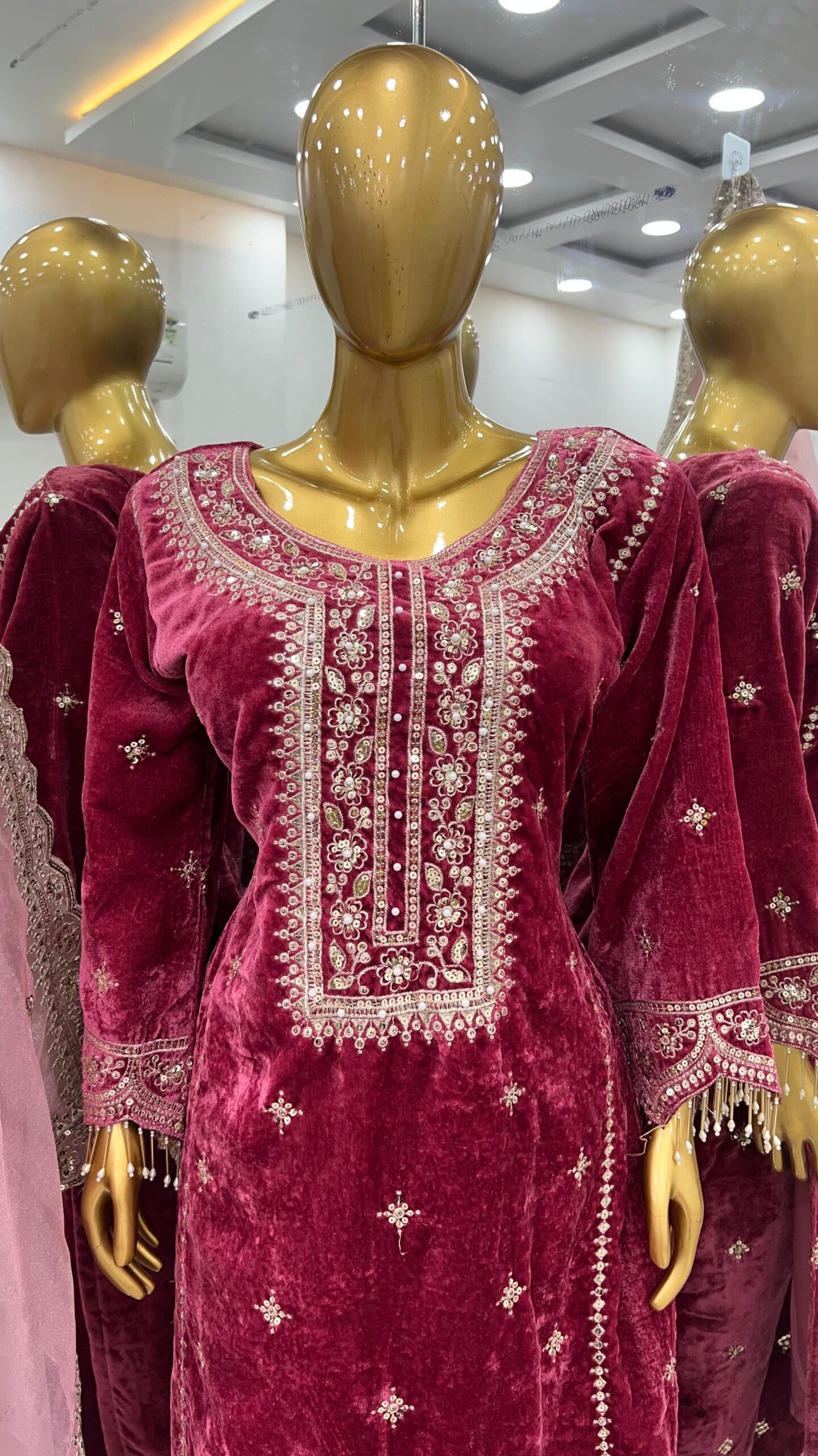 | Top | Pure Heavy Viscose Velvet with Heavy Embroidery Sequence Work & Neck Moti Work (Full Sleeves) |