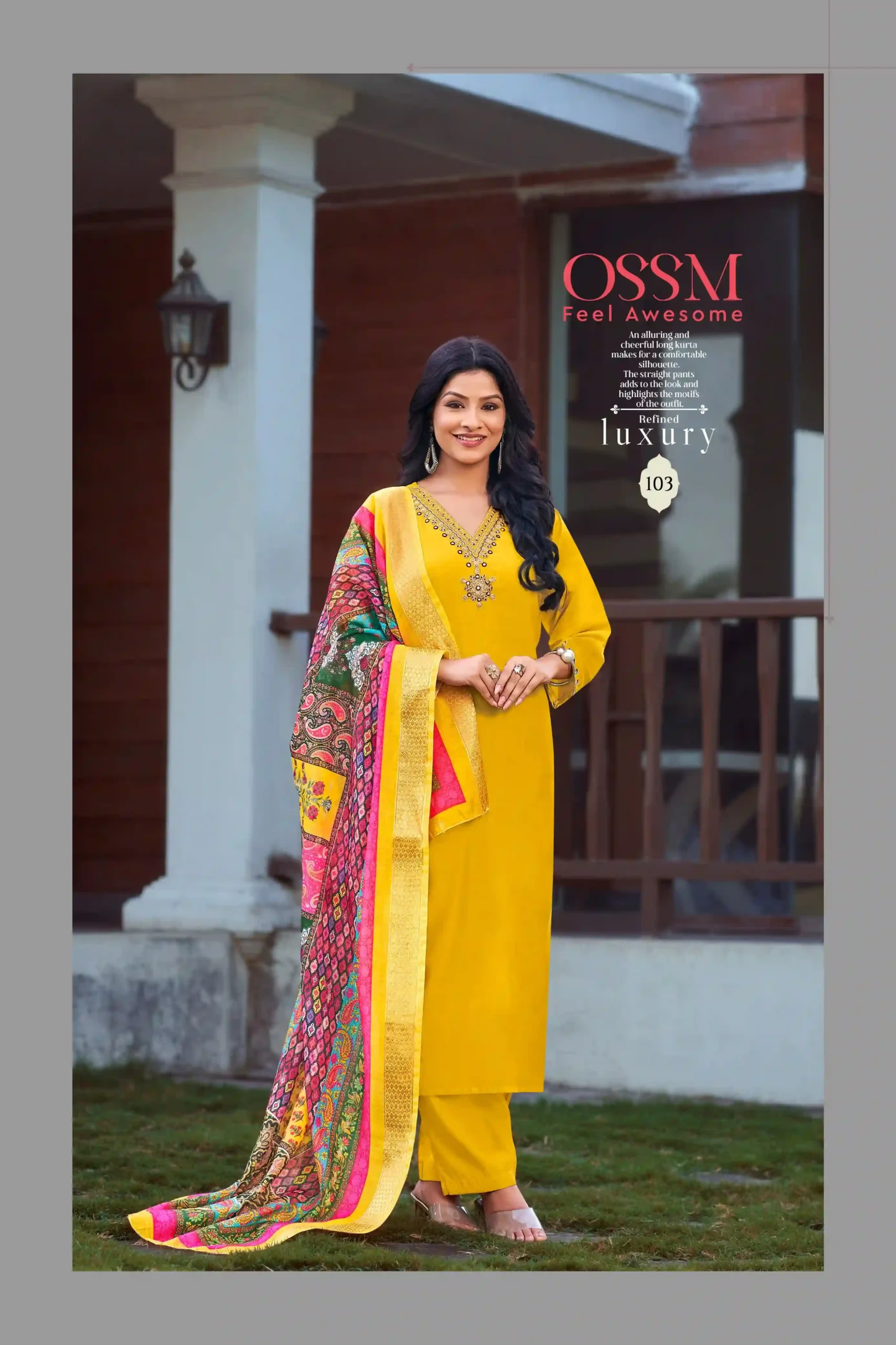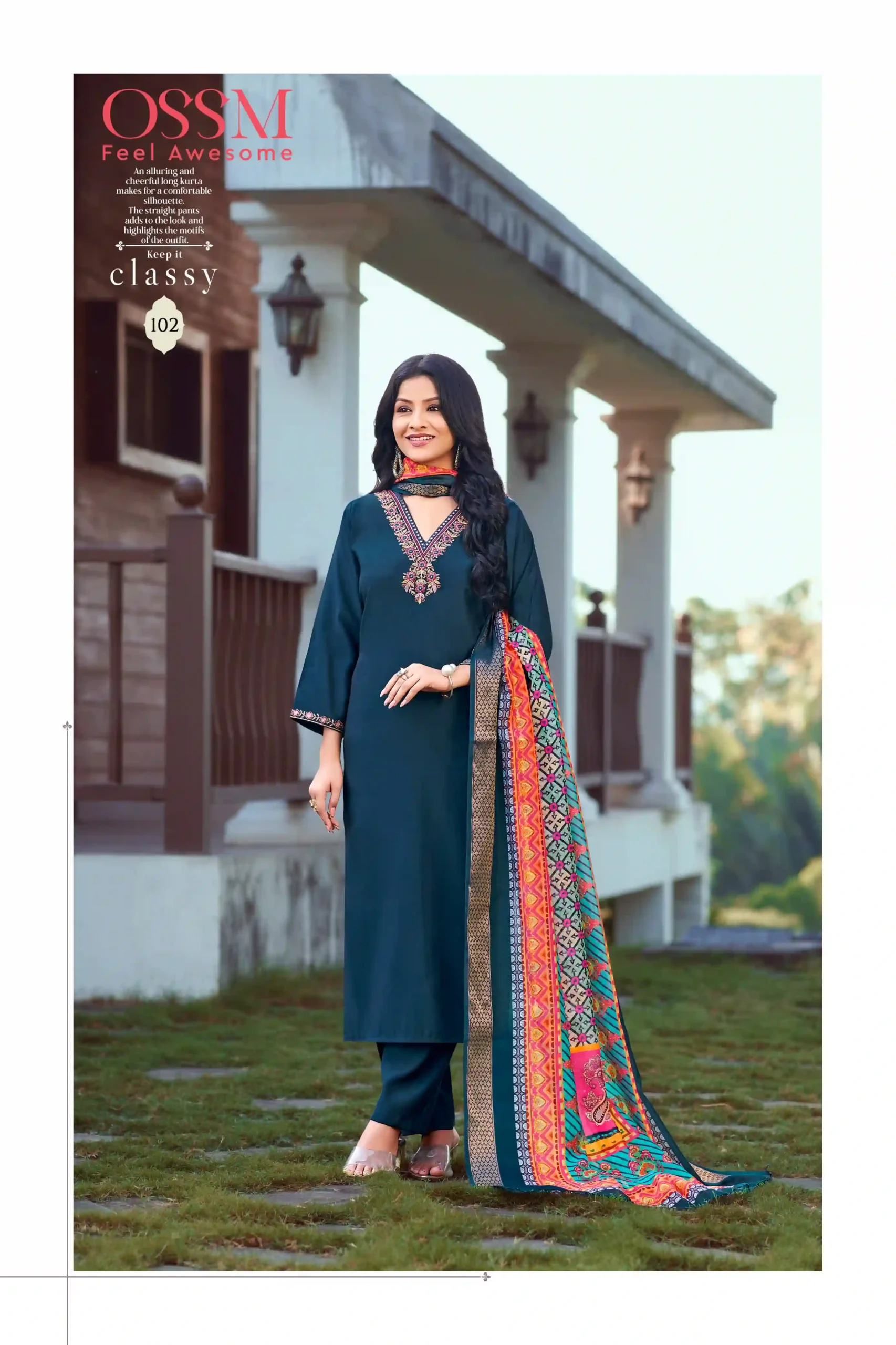 - Top: Made from Pure Viscose Roman Silk, known for its smooth texture and elegant drape, providing a sophisticated look.