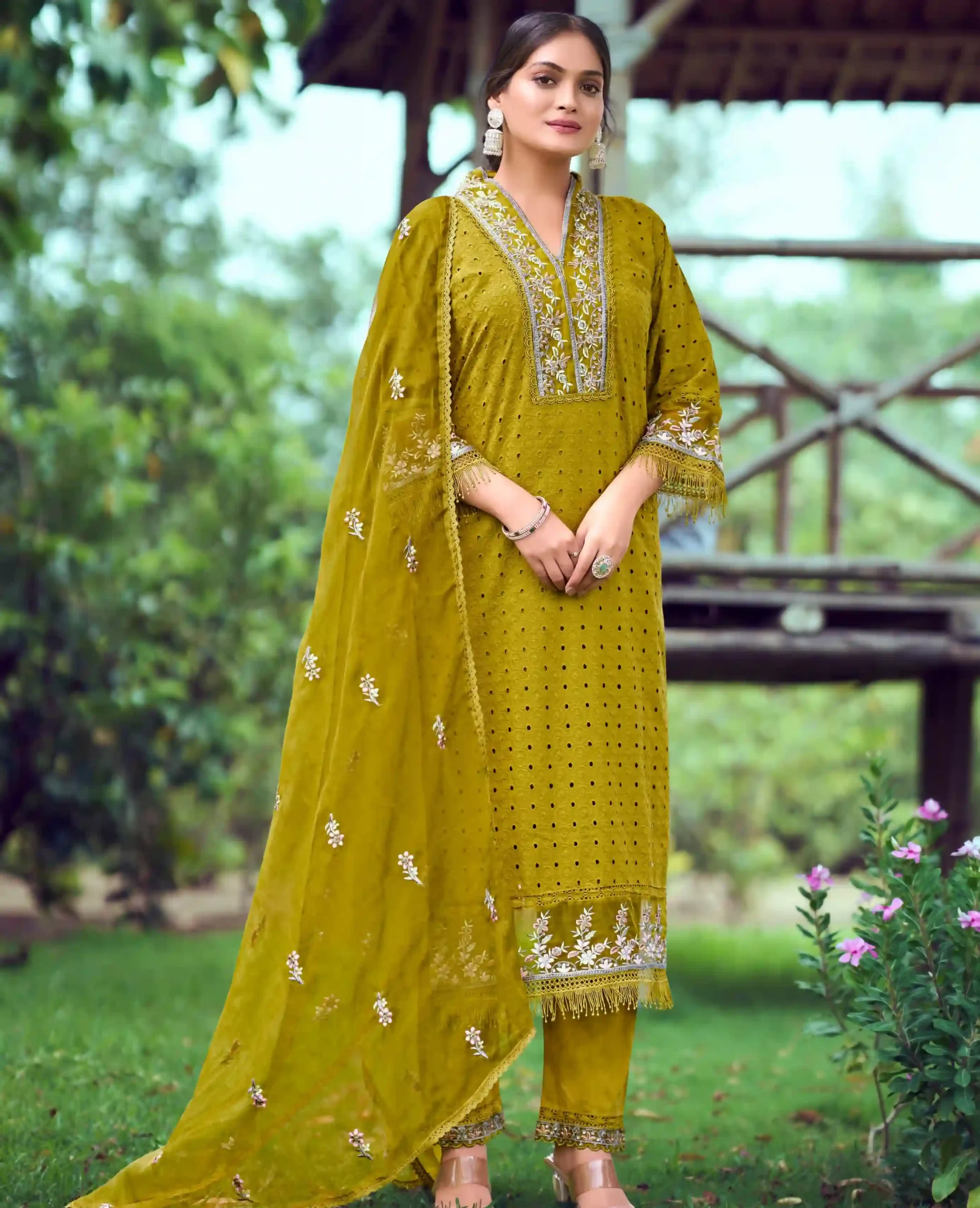 - Design: The Chikankari embroidery on the top is a traditional Indian craft known for its intricate and delicate patterns. Enhanced with heavy embroidery and complemented by lace work, the top stands out with its elegant and detailed design.