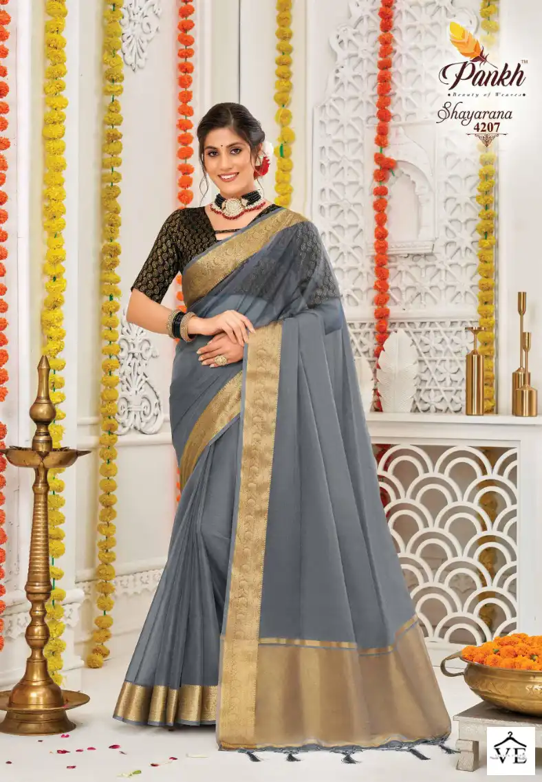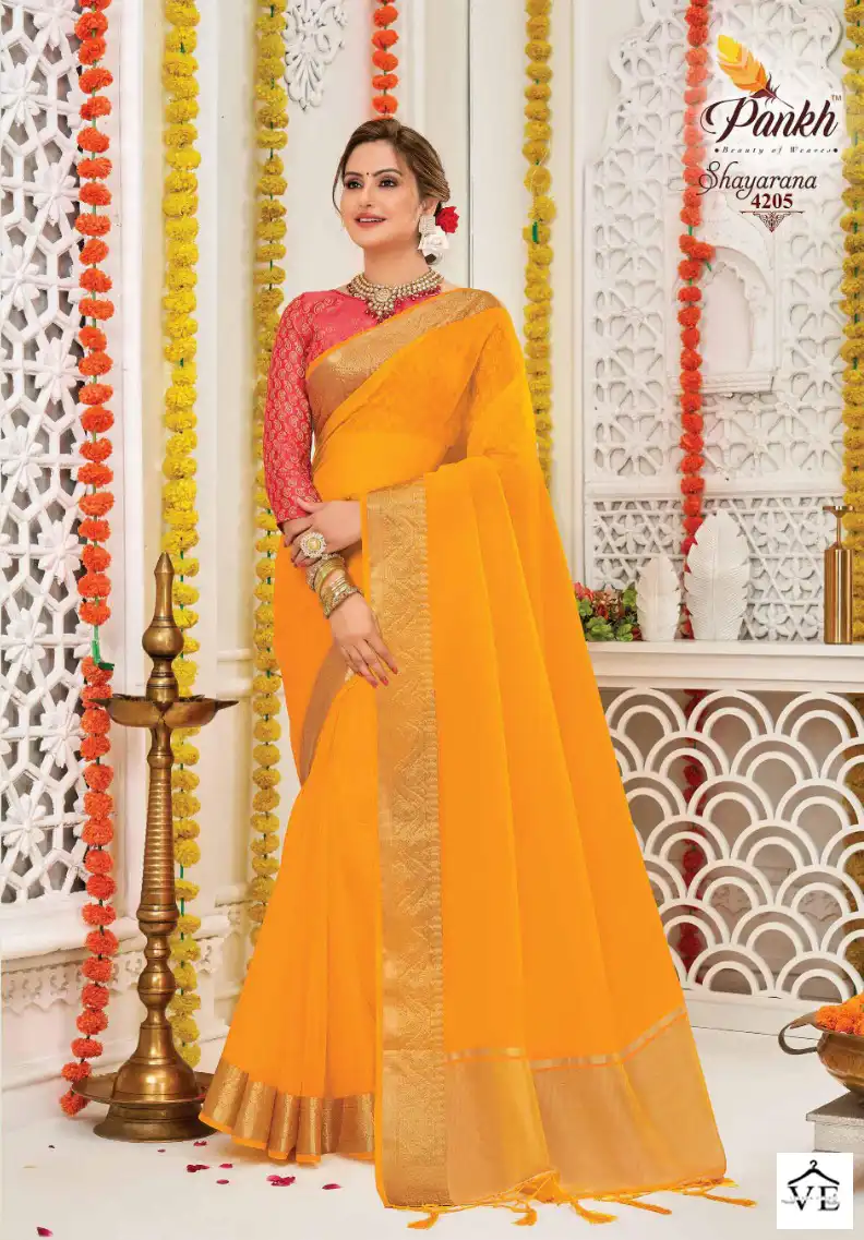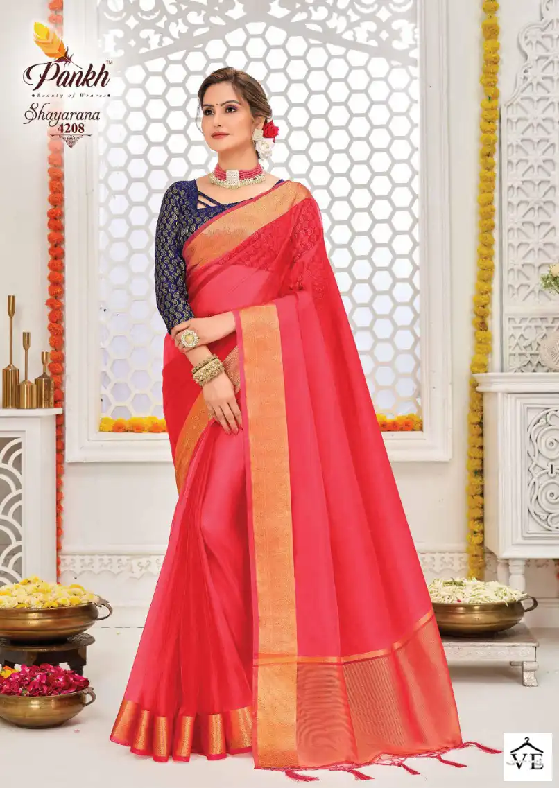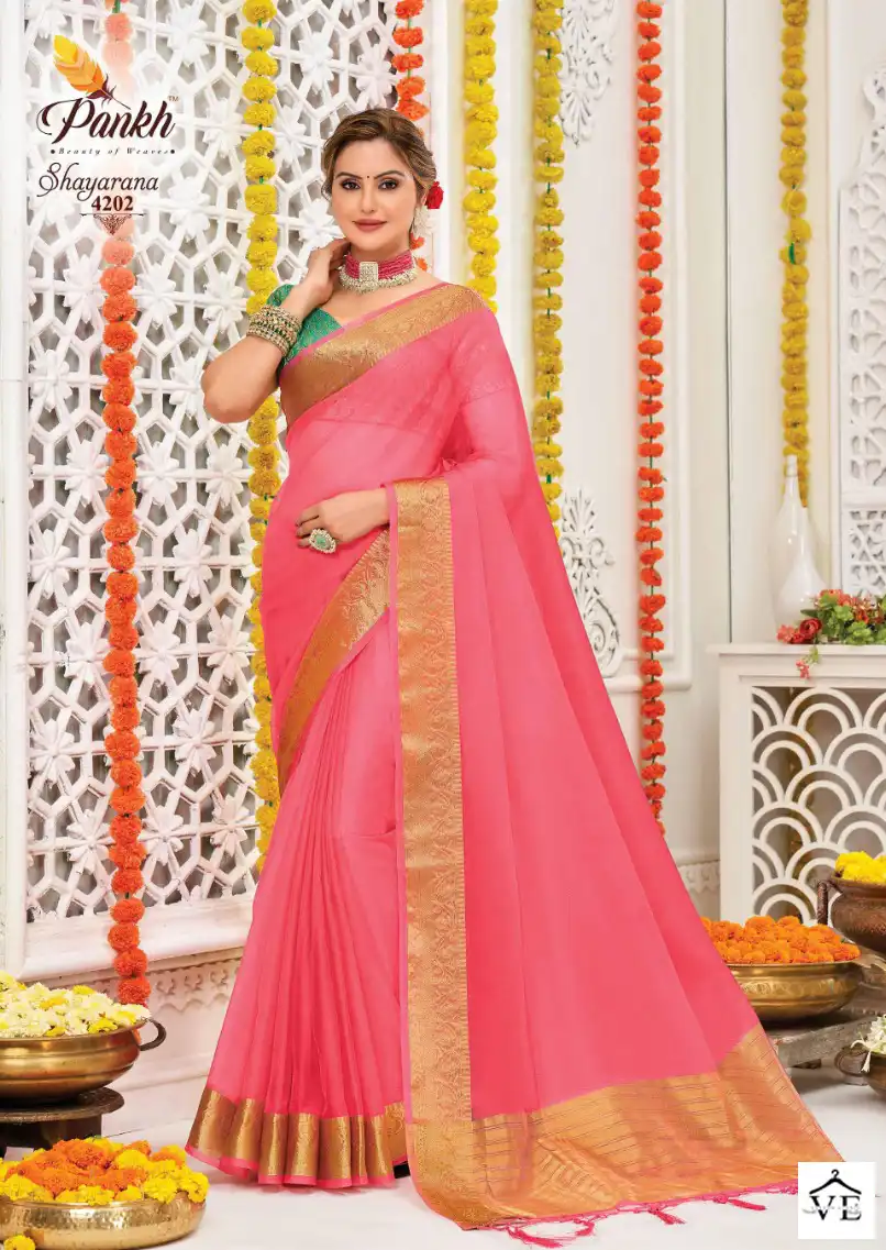 Pankh Sharyana Vol-1 Organza Silk Wholesale Saree Catalog of 10 Pcs. We deal in Kurtis, Sarees, Dresses Materials, Leggings, and Designer Salwar Kameez.