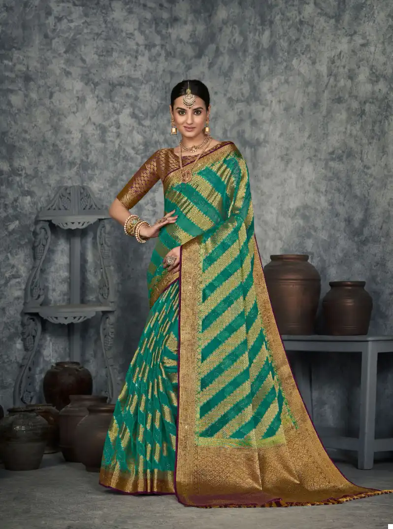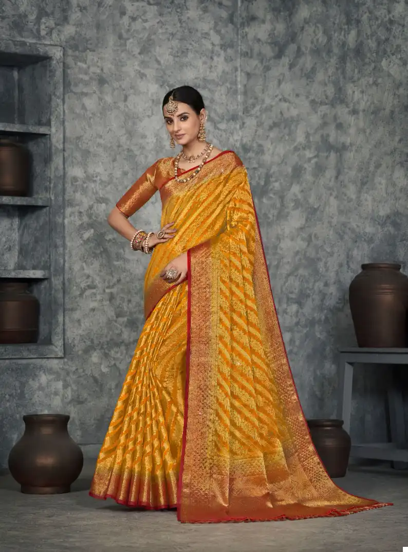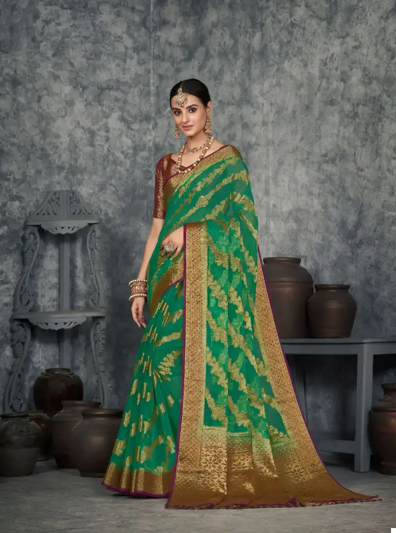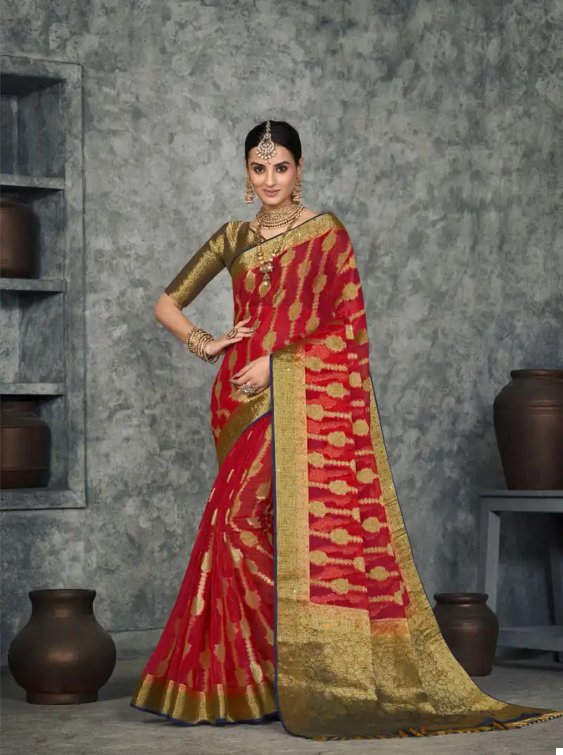 - Organza Silk Fabric: Immerse yourself in the sheer luxury of organza silk, a fabric known for its delicate texture, subtle sheen, and luxurious drape. These sarees are crafted from premium Suchitra Silk Organza, ensuring a graceful and ethereal presence.