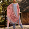 This elegant salwar suit set features luxurious pure muslin silk fabric adorned with intricate digital prints and heavy fancy work, creating a sophisticated and stylish ensemble suitable for various occasions.