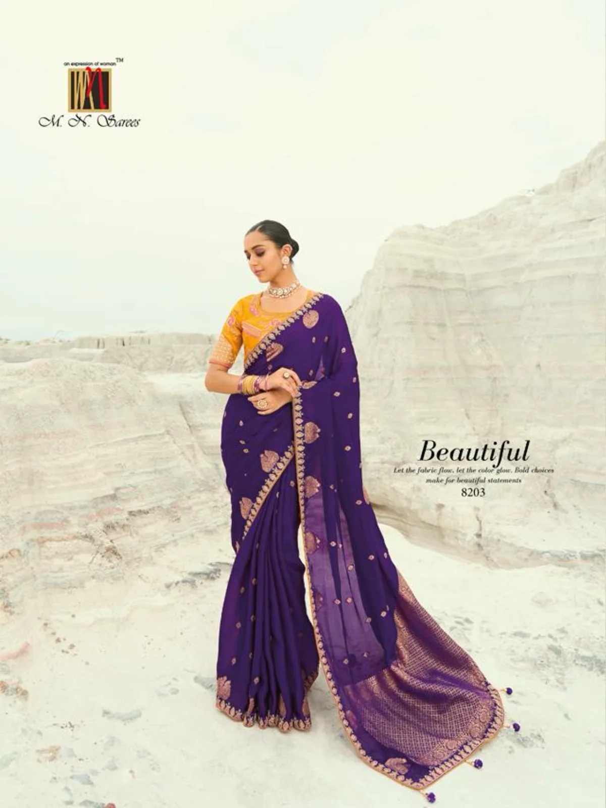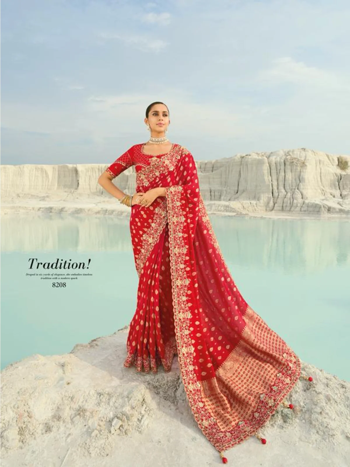 - Indulge in timeless elegance with our Premium Pure Organza & Pure Dola Viscose Satin Saree Collection, meticulously designed for women who appreciate luxury, craftsmanship, and graceful ethnic wear. This exclusive designer range (Design No. 8201 to 8208) showcases a perfect blend of traditional artistry and modern sophistication, making it an ideal choice for weddings, festive celebrations, parties, and grand occasions.