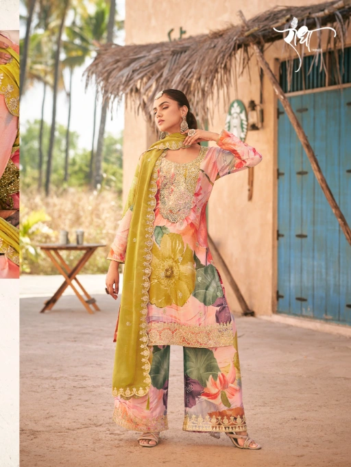 • Bottom: Heavy Premium Chinon with Digital Print & Embroidery (Free Size Stitched)