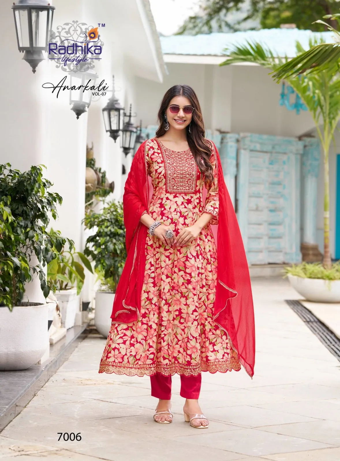 Radhika Anarkali Vol 7 Rayon Foil Print Kurti Pant And Dupatta Set