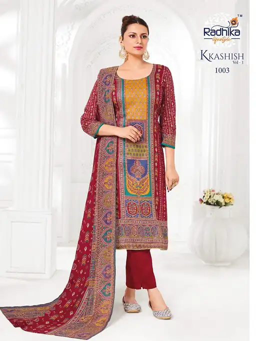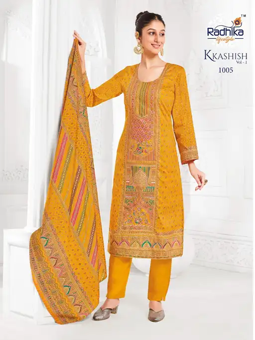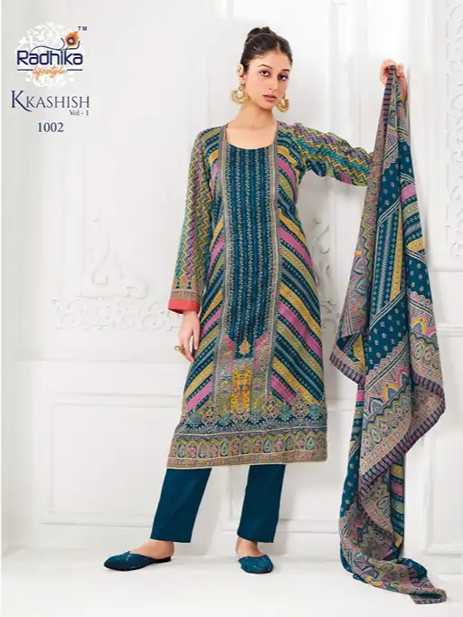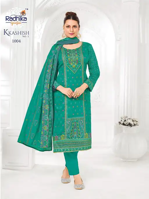 Shop Radhika Kkashish Vol 1 designer satin suits with modal dupatta in all sizes. Wholesale prices online at Vardan Ethnic. Free size options. (145 characters)