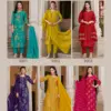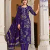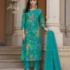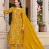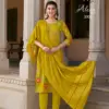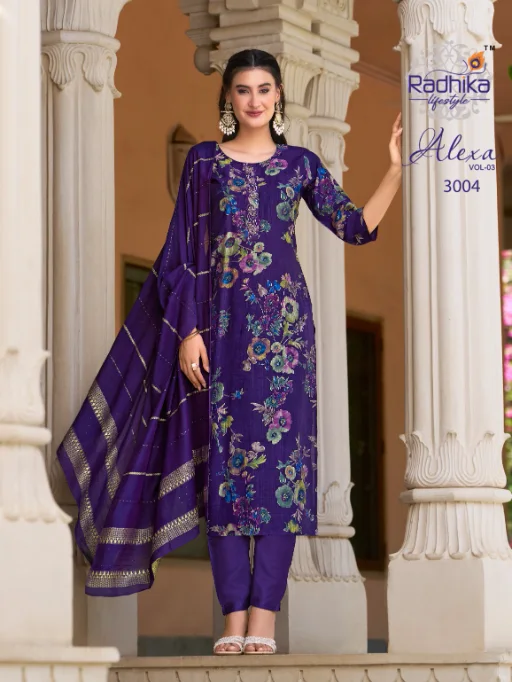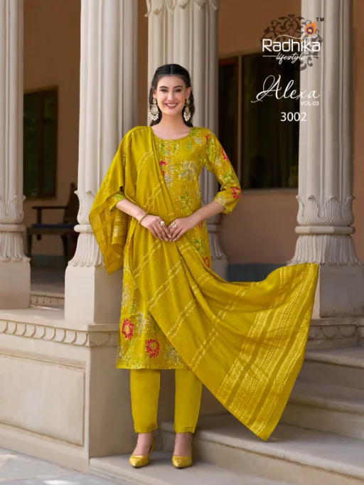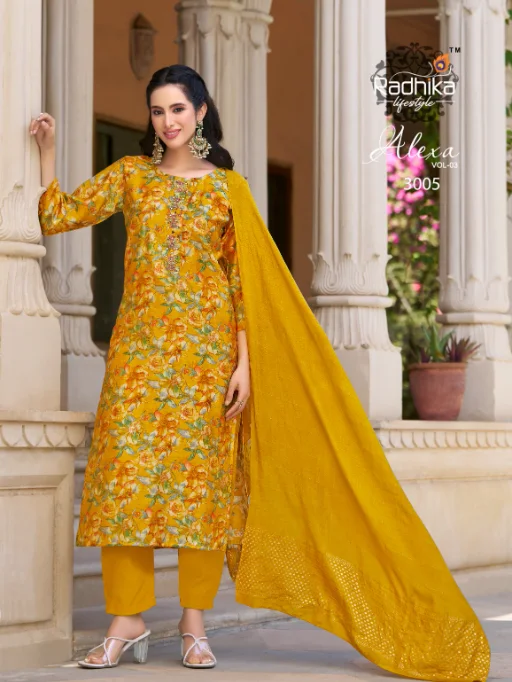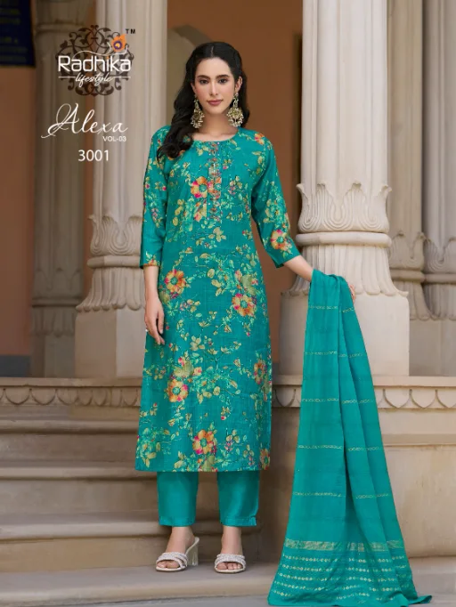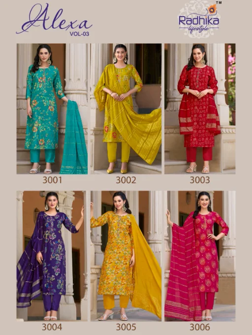 Buy Radhika Lifestyle Alexa 3 stylish kurti set online at the best wholesale price. This elegant 3-piece ethnic wear set features a Vartican silk kurti and pant combo with exquisite foil print and handwork, paired beautifully with a rich Muslin Jacquard dupatta. A perfect fusion of festive fashion and comfort, ideal for casual and occasional wear.