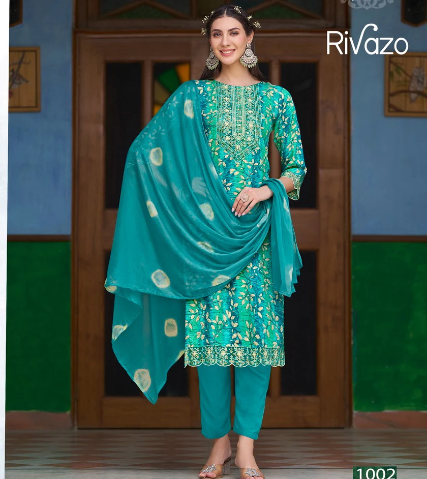 - Bottom: Heavy Rayon Foil Print with Embroidery Work