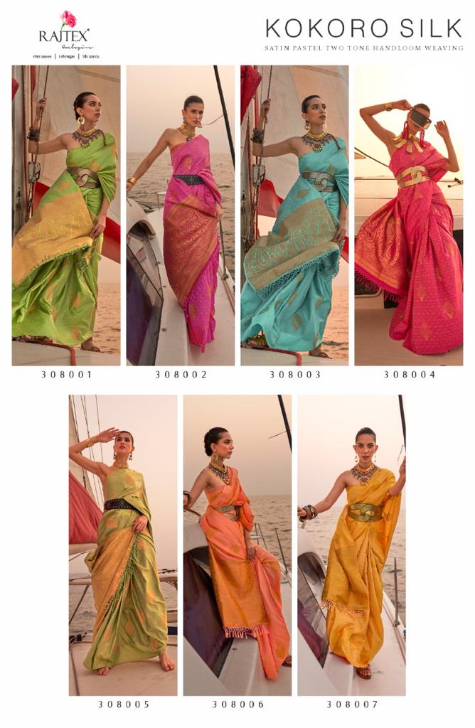 Raj Tex Kokoro Silk Satin Self Pastel Two Tone Wholesale Sarees Catalog 7 Pcs. We deal in Kurtis, Sarees, Dresses Materials, Leggings, and Designer Salwar Kameez.