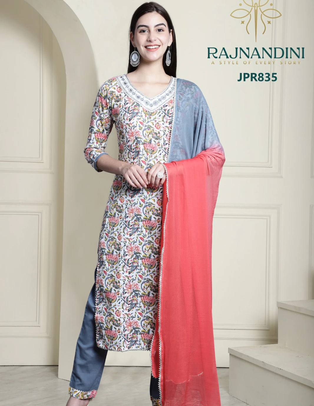 Pure Cambric Cotton (60*60) Trendy Printed Kurta Set with Work in Jaipuri Prints |