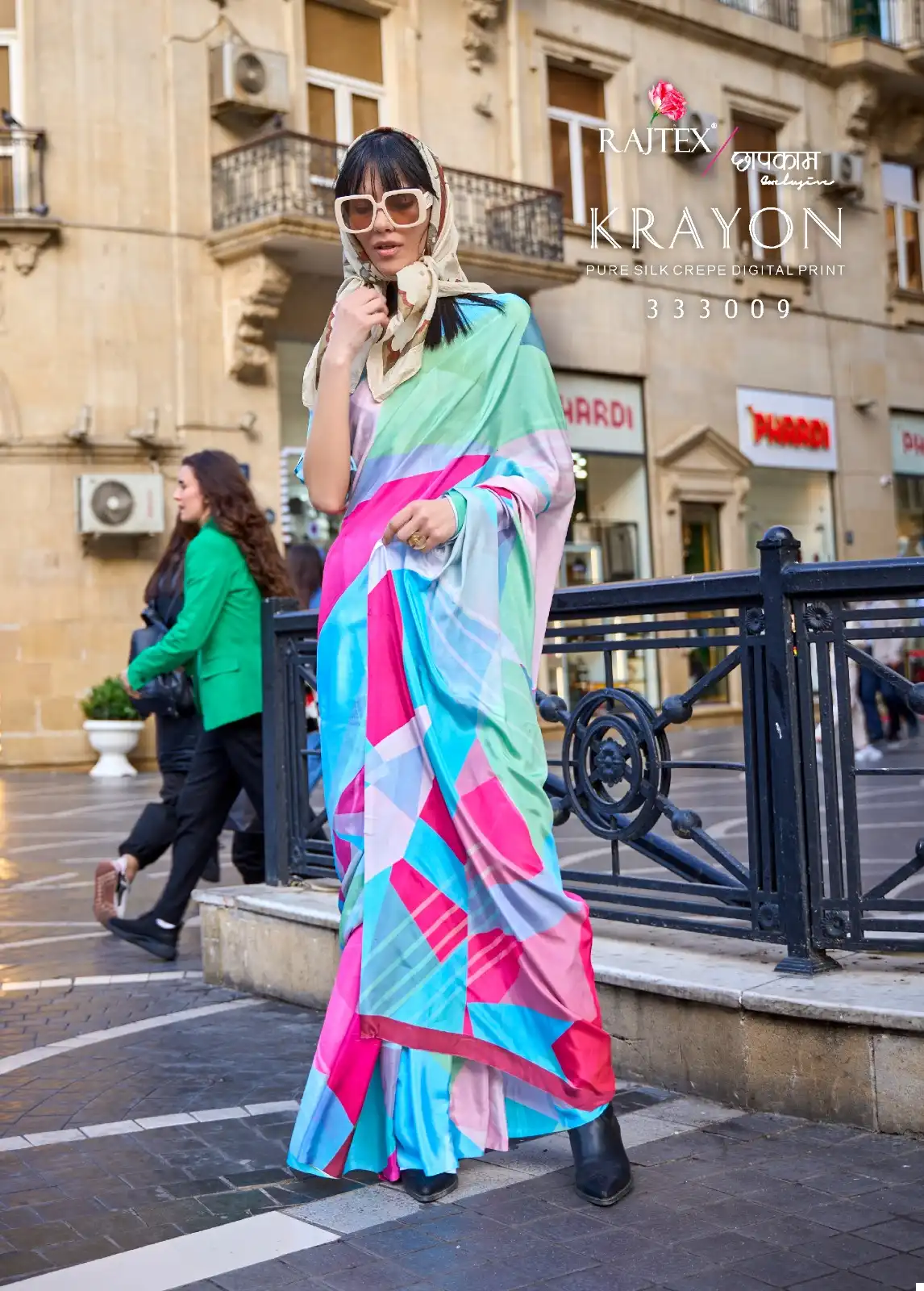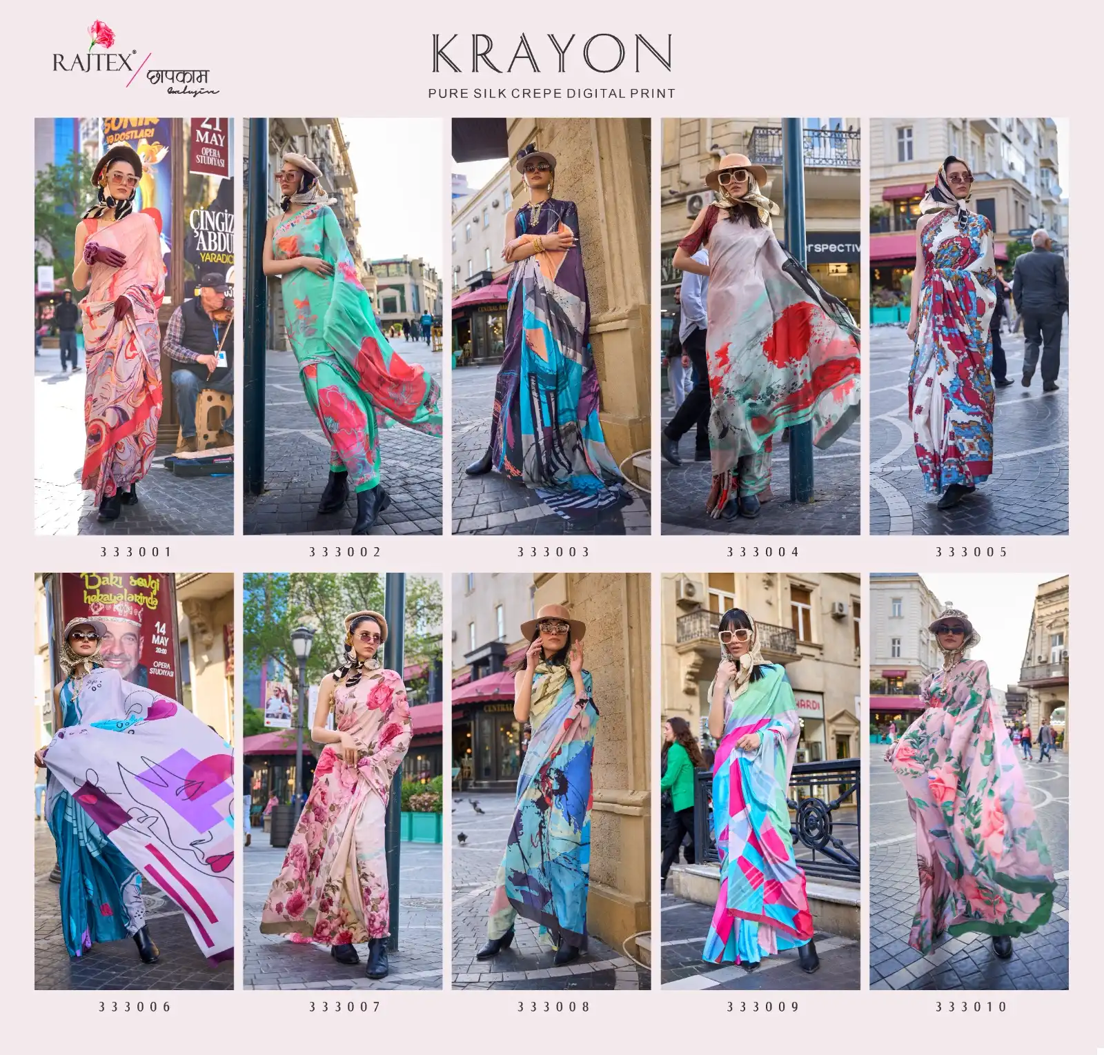 Priced at ₹1020 per piece, this silk crape saree collection offers a blend of luxury and modernity. Each saree is crafted from high-quality silk crape fabric with digital prints, paired with a matching silk blouse. Available in 10 vibrant colors, customers can pick and choose their preferred options. Perfect for weddings, parties, and festive occasions, these sarees are sure to make a statement with their exquisite design and luxurious fabric.