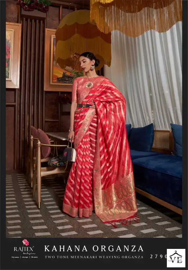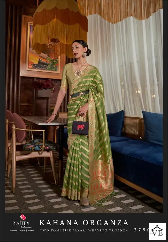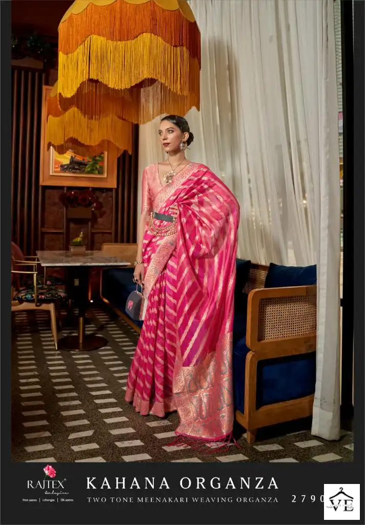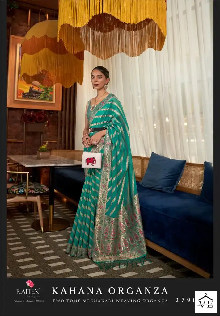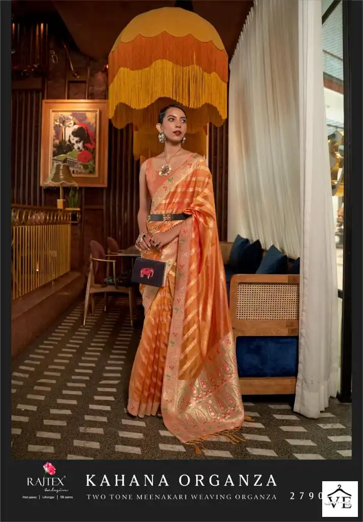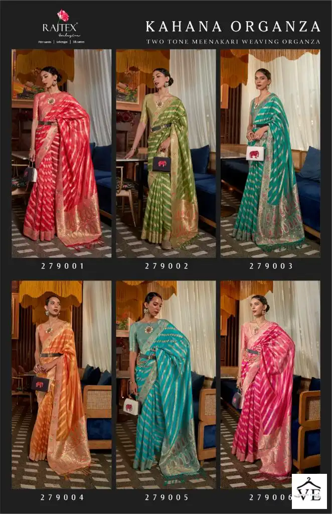 Rajtex Kahana Organza Two Tone Meenakari Wholesale Sarees Catalog 6 Pcs. We deal in Kurtis, Sarees, Dresses Materials, Leggings, and Designer Salwar Kameez.