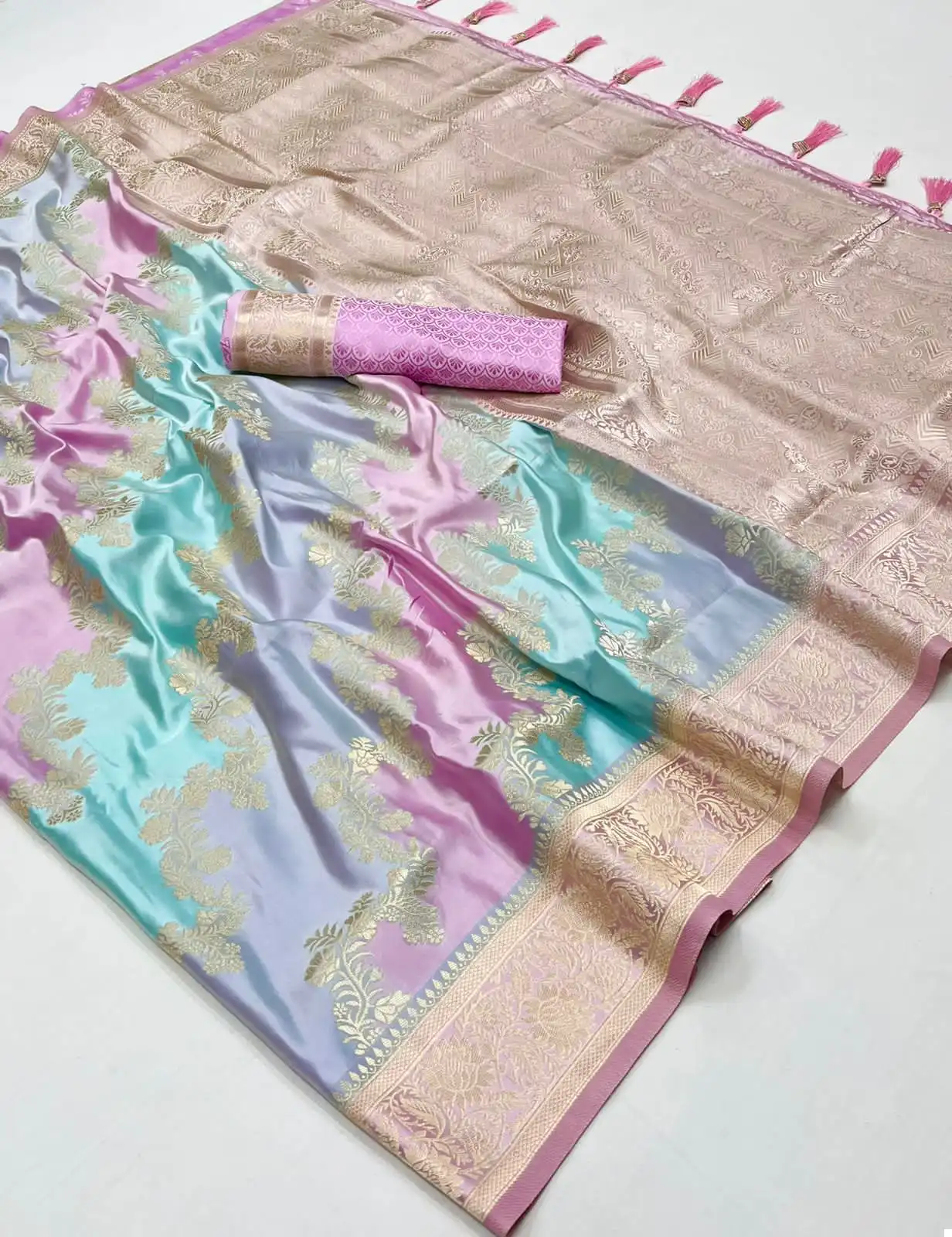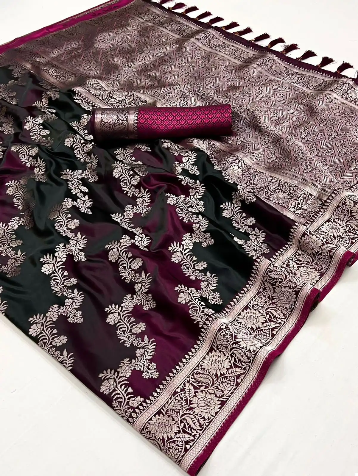 - Blouse: A matching blouse in the same lustrous satin silk fabric complements the saree, waiting to be tailored into a statement piece that resonates with your personal style.
