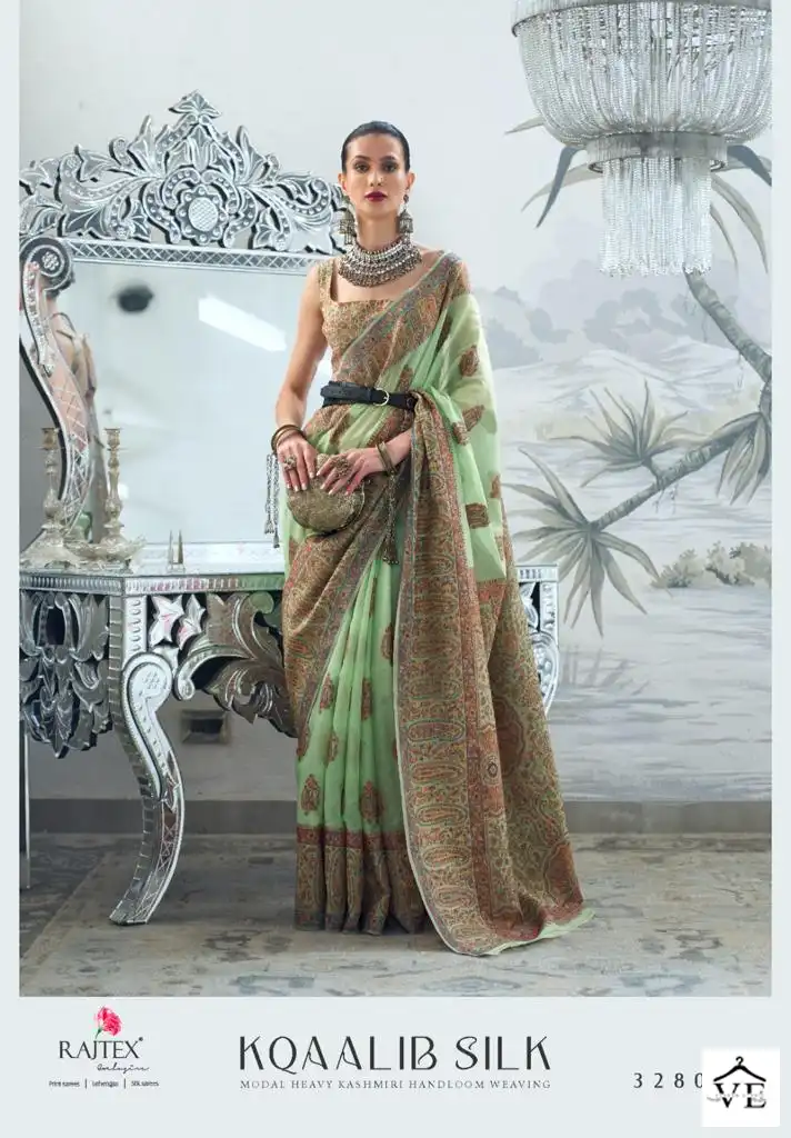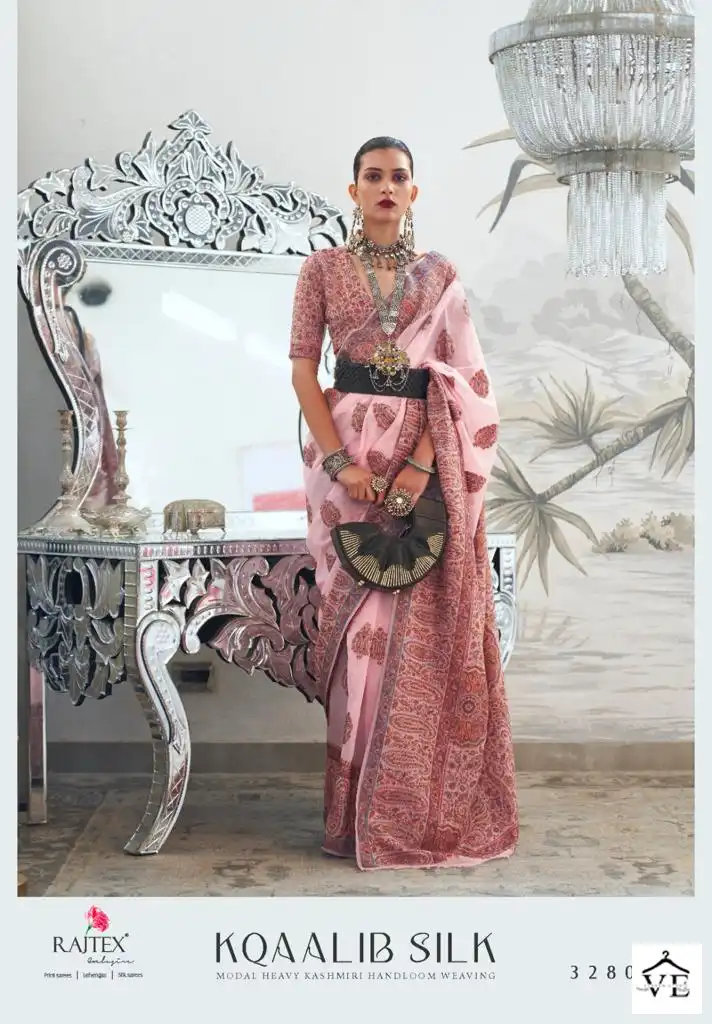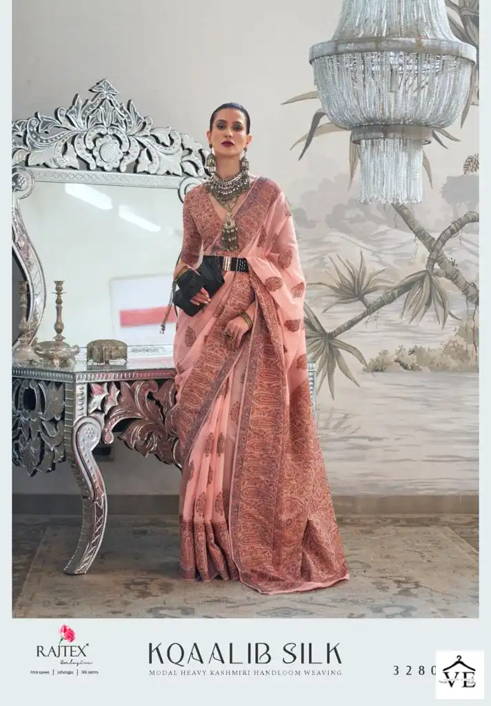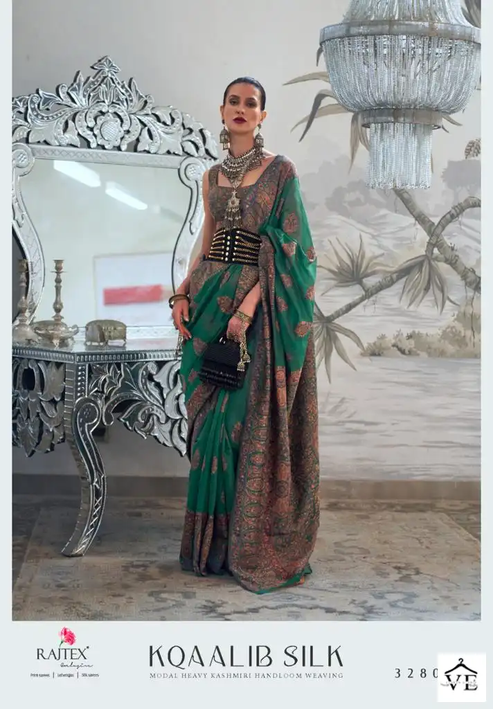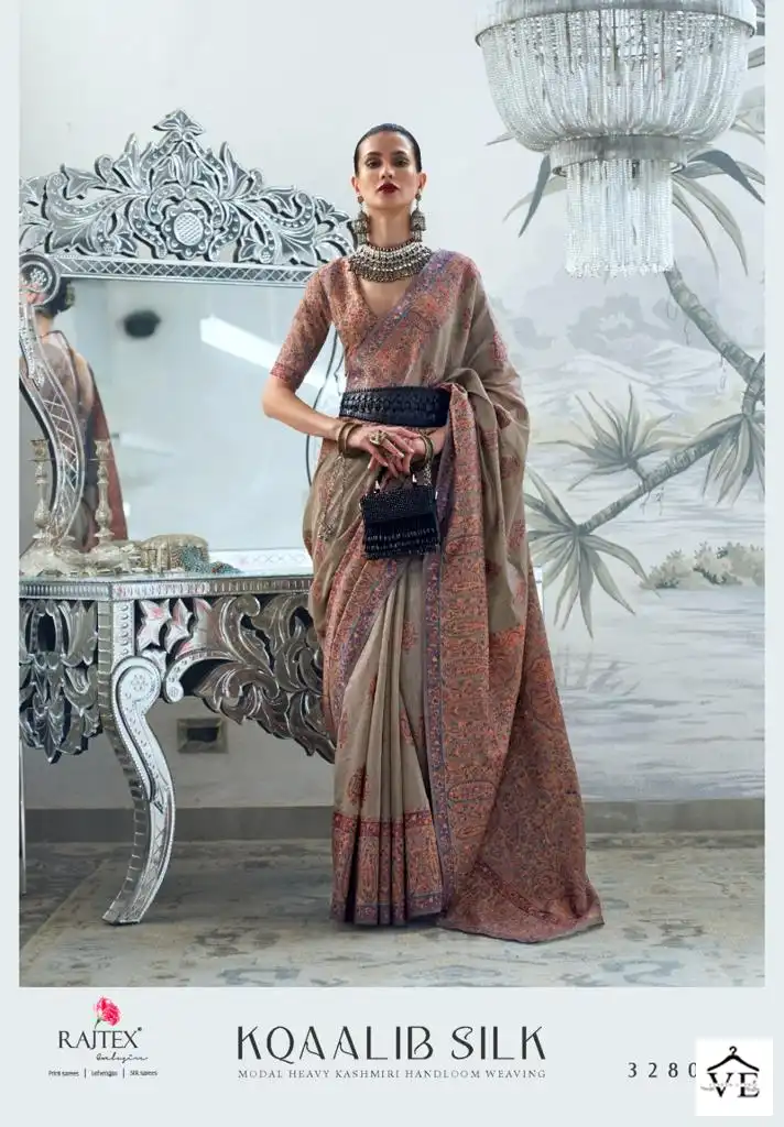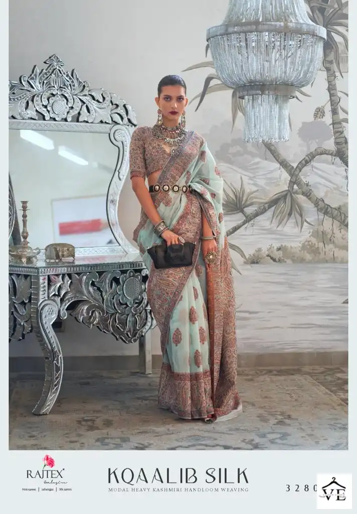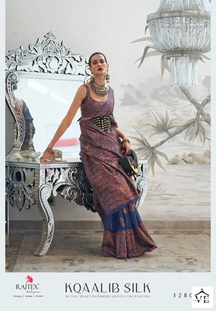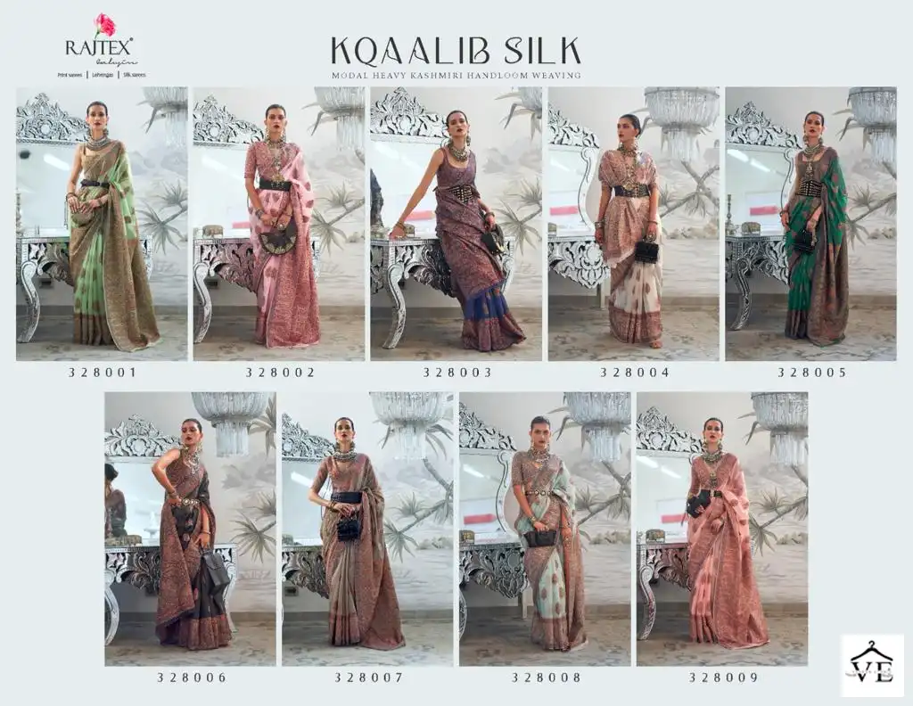 Rajtex Kqaalib Silk Modal Heavy Kashmiri Wholesale Saree Catalog of 9 Pcs. We deal in Kurtis, Sarees, Dresses Materials, Leggings, and Designer Salwar Kameez.
