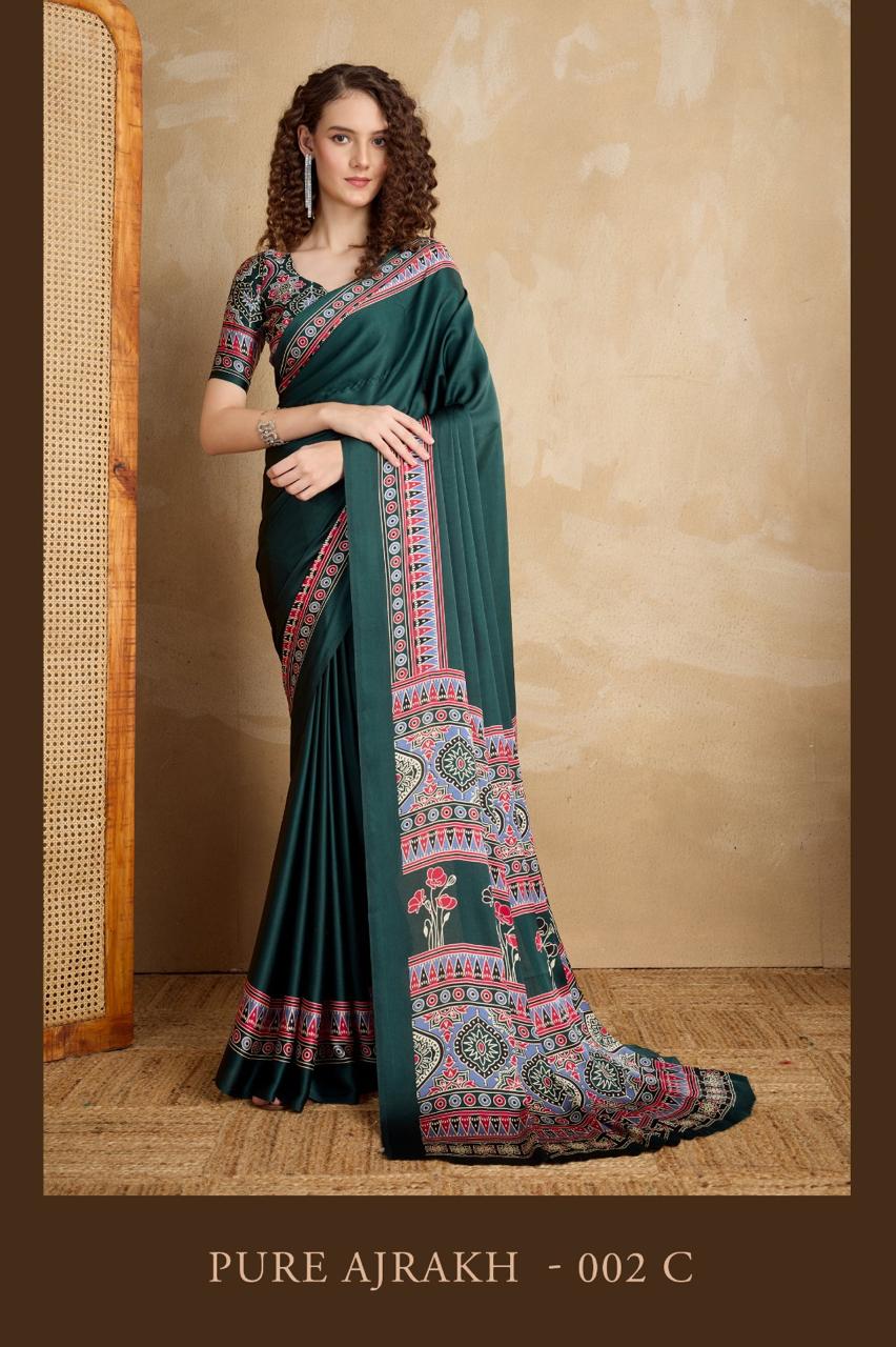 ✨ Shop more Ajrakh and satin printed sarees only at Vardan Ethnic.