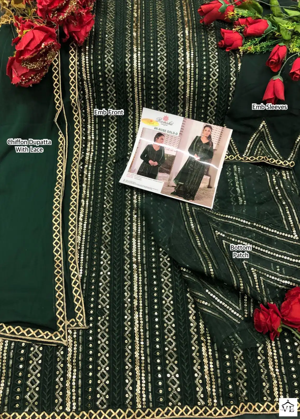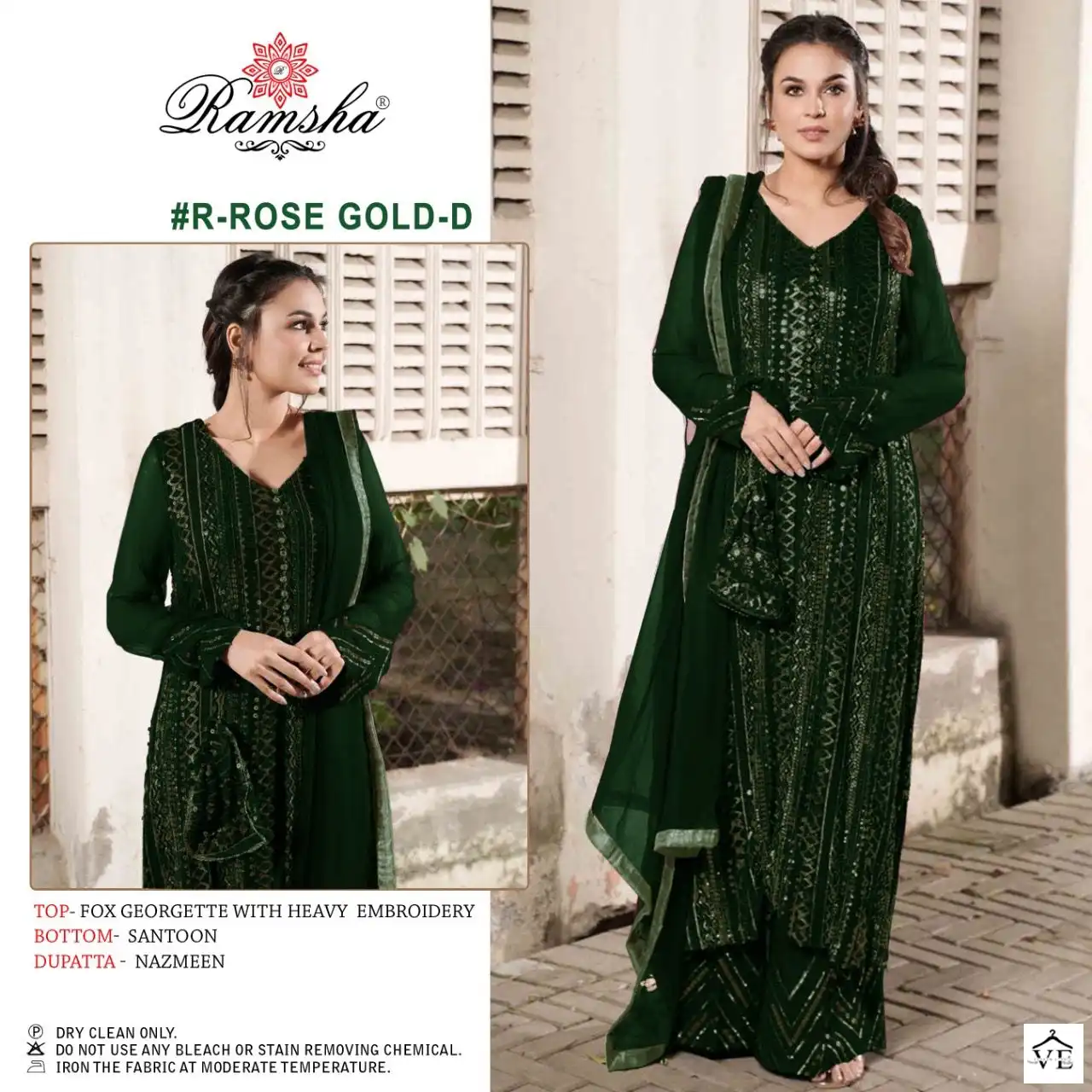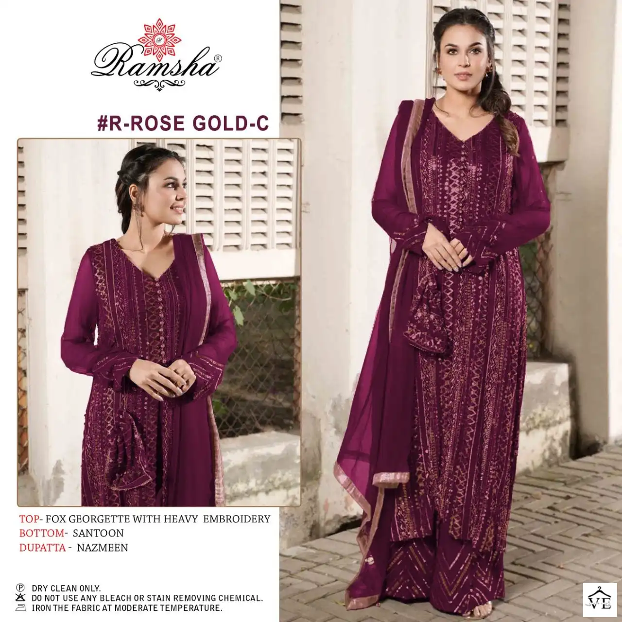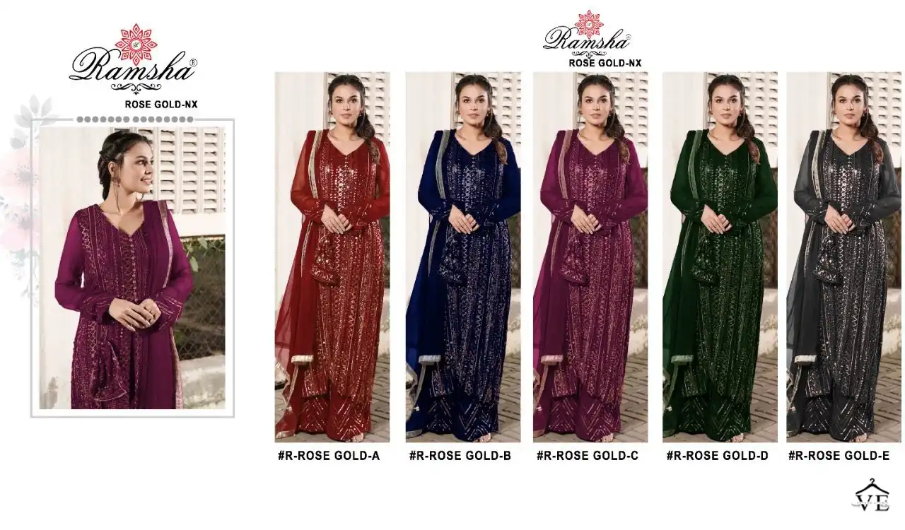 Ramsha Rose Gold Colours Faux Georgette Wholesale Pakistani Suit Catalog of 5 Pcs. We deal in Kurtis, Sarees, Dresses Materials, Leggings, and Designer Salwar Kameez.