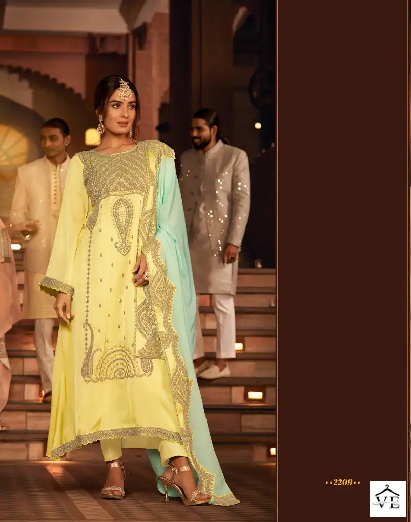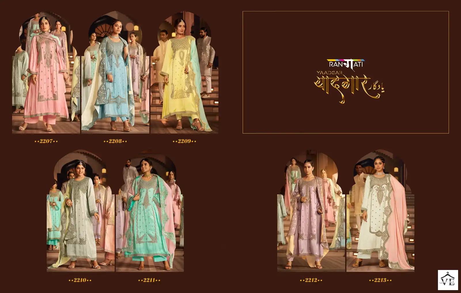 Rangati Yaadgar Bemberg Gajji Silk Wholesale Designer Pakistani Suits Catalog of 7 Pcs. We deal in Kurtis, Sarees, Dresses Materials, Leggings, and Designer Salwar Kameez.