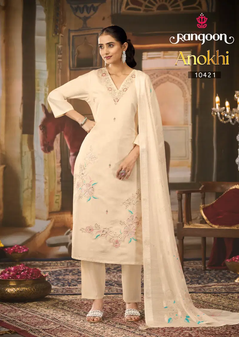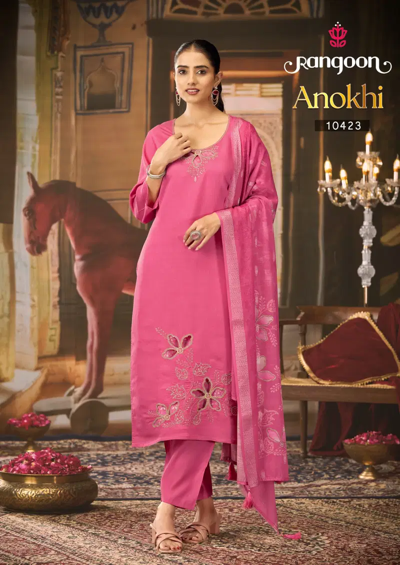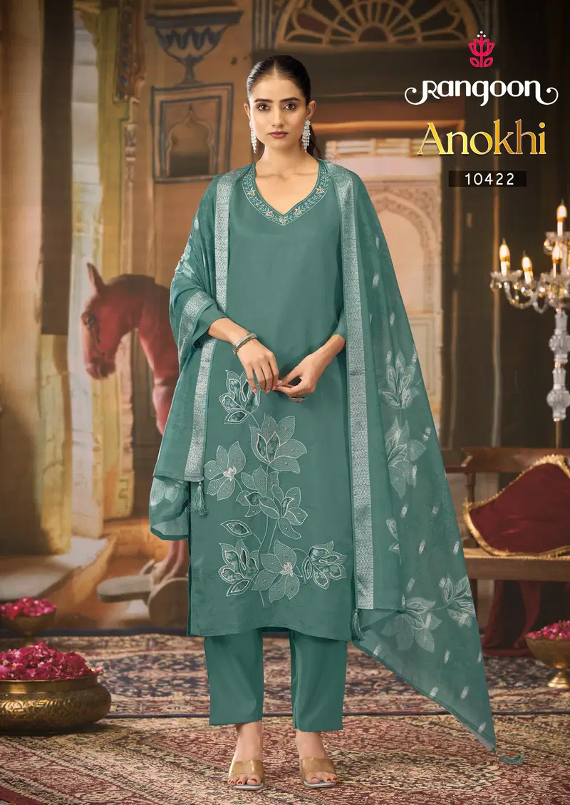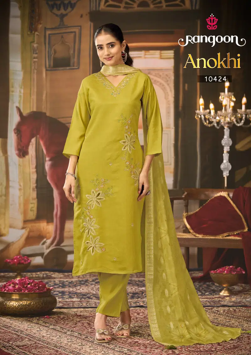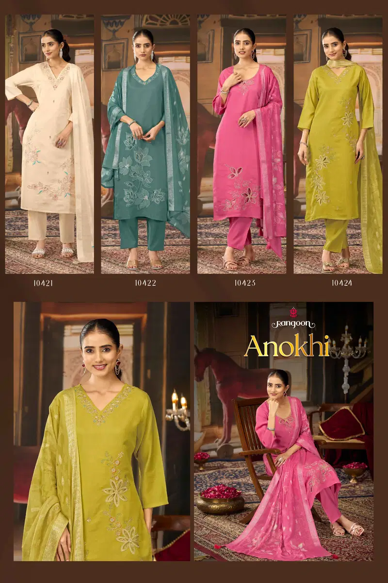- Perfect for festival wear, ethnic occasions, and boutique collections, the Rangoon Anokhi catalog is available in four attractive designs and popular size options from M to XXL, ensuring broad customer appeal. With affordable pricing, consistent quality, and elegant styling, this collection is an excellent choice for wholesalers, retailers, resellers, and online sellers looking to stock fast-moving festive ethnic wear.