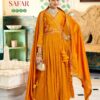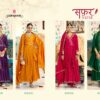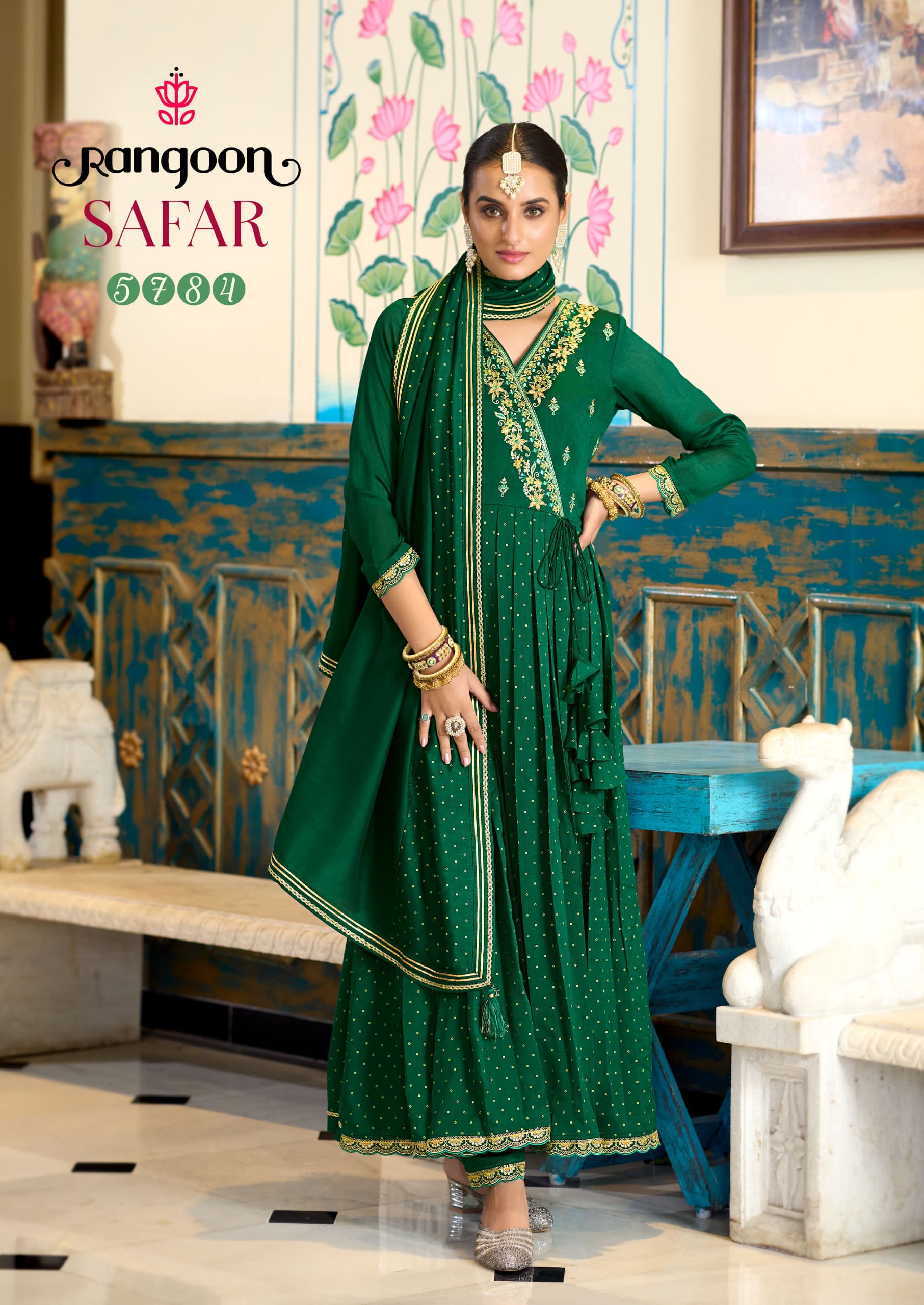 Rangoon introduces Safar, a designer Anarkali collection crafted in silk with intricate embroidery, ivory prints, and khatli handwork mirror details. The silk lace pant and four-side lace border dupatta add a regal charm, making it perfect for festive and wedding wear.