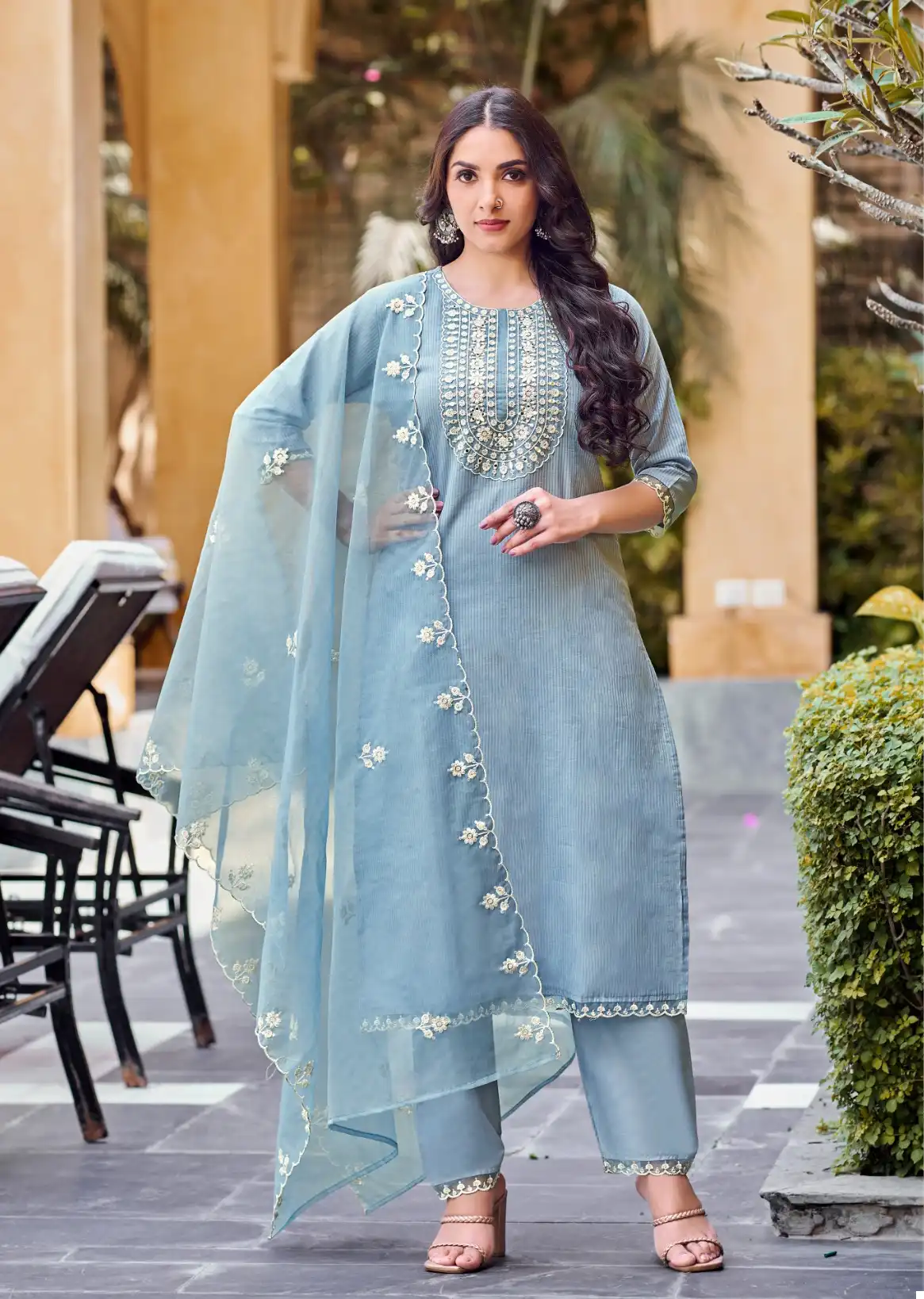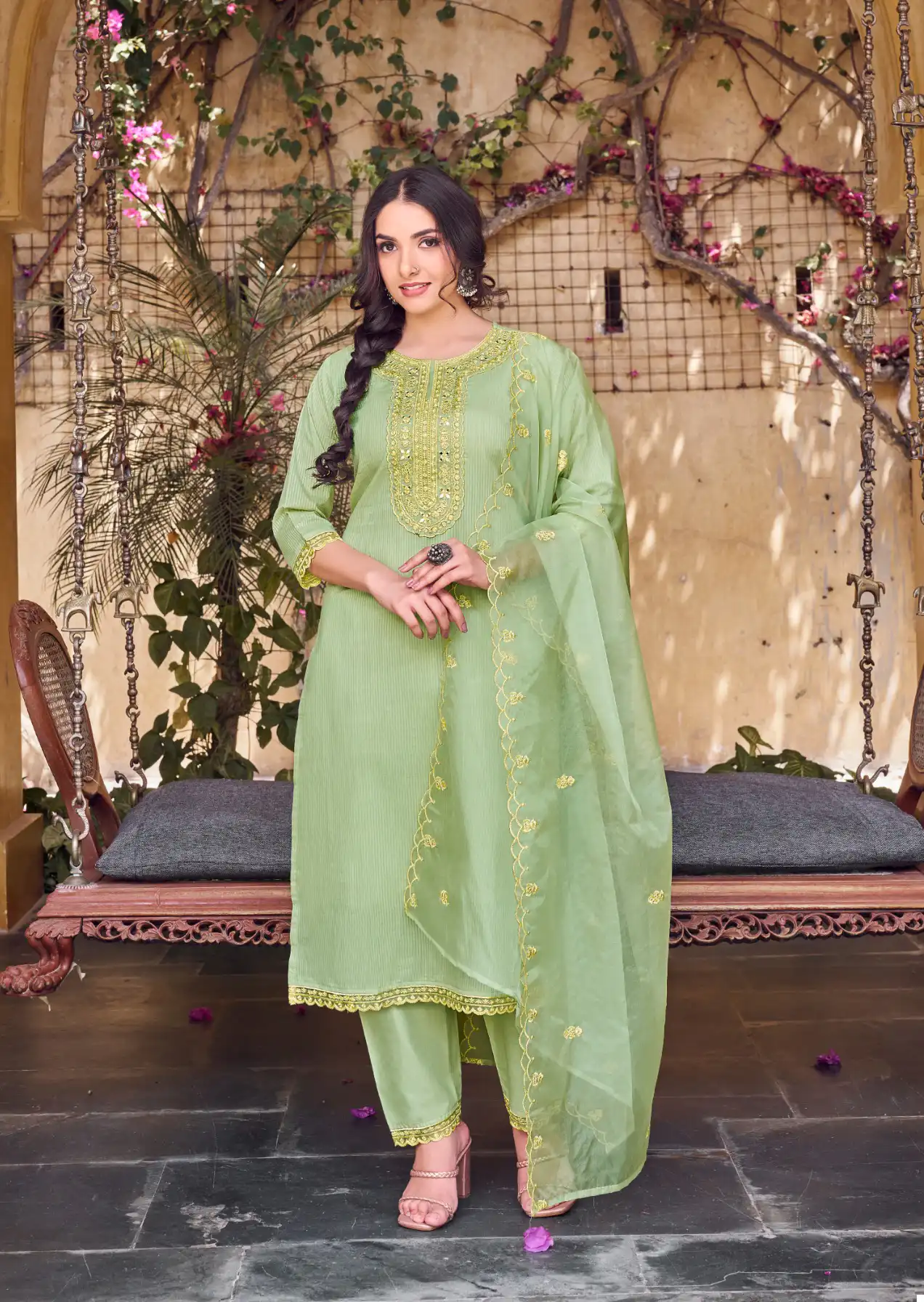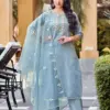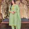 - The dupatta is crafted from Organza and adorned with heavy embroidery work.