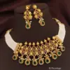 Discover the epitome of heritage and craftsmanship with our “Regal Elegance Brass High Gold Antique Choker Set.” This exquisite set, featuring a choker and matching earrings, is a testament to the timeless beauty of antique jewelry. The choker is meticulously crafted from high-quality brass with a rich gold finish that exudes an heirloom quality. Adorned with deep burgundy square gems and lustrous pearls, it features a row of teardrop-shaped emerald-hued stones that bring a touch of royal sophistication. The earrings, designed to complement the choker, echo its design with burgundy gems, a central floral motif, and a dangling teardrop stone encircled by tiny pearls. This set is a dazzling addition to any formal attire, perfect for weddings, galas, and any event where you wish to make a statement.
