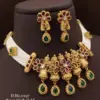 Discover the epitome of heritage and craftsmanship with our “Regal Elegance Brass High Gold Antique Choker Set.” This exquisite set, featuring a choker and matching earrings, is a testament to the timeless beauty of antique jewelry. The choker is meticulously crafted from high-quality brass with a rich gold finish that exudes an heirloom quality. Adorned with deep burgundy square gems and lustrous pearls, it features a row of teardrop-shaped emerald-hued stones that bring a touch of royal sophistication. The earrings, designed to complement the choker, echo its design with burgundy gems, a central floral motif, and a dangling teardrop stone encircled by tiny pearls. This set is a dazzling addition to any formal attire, perfect for weddings, galas, and any event where you wish to make a statement.
